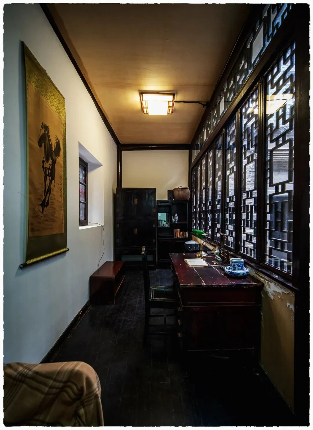 厢房里复原了先生的书房与卧室,书房案几上笔墨整齐摆放,仿佛先生只是暂时起身,片刻便会回来挑灯夜读。窗棂上糊着的素色窗纸,滤过柔和的光线,洒在书页上,氛围感拉满,是拍照出片的好地方,建议穿素色、中式风格的衣物,随手就能拍出复古雅致的照片,拍照时请勿触摸展品、使用闪光灯。卧室陈设简单,一张木床、一个衣柜、一张梳妆台,处处透着简朴,彰显着先生淡泊名利的品格。