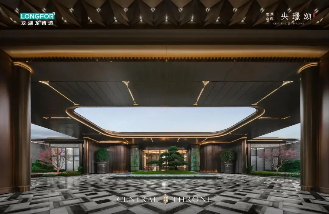 穿过门庭,缓至翡翠松院,媲美高奢酒店的环岛落客区;四面屋顶形成天井,四水归堂的形制、翡翠玉台的设计,寓意财富的聚拢和传承。