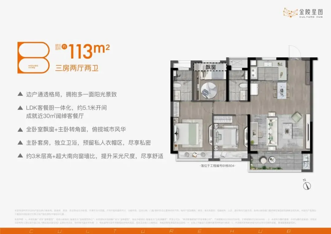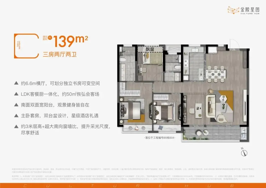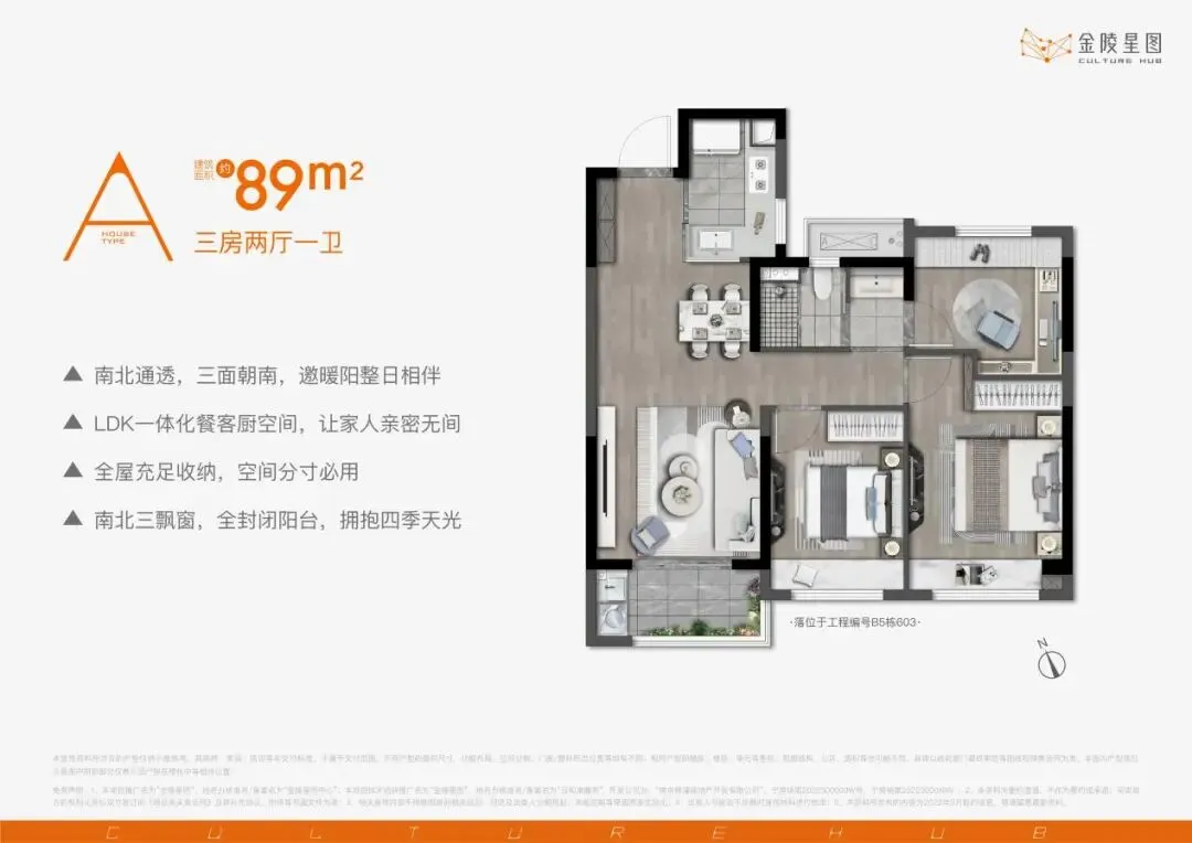 户型方面,项目打造约89-128㎡全周期成品空间户型(89㎡三房两厅一卫/105㎡三房两厅两卫/128㎡四房两厅两卫),适配城市先锋改善需求。