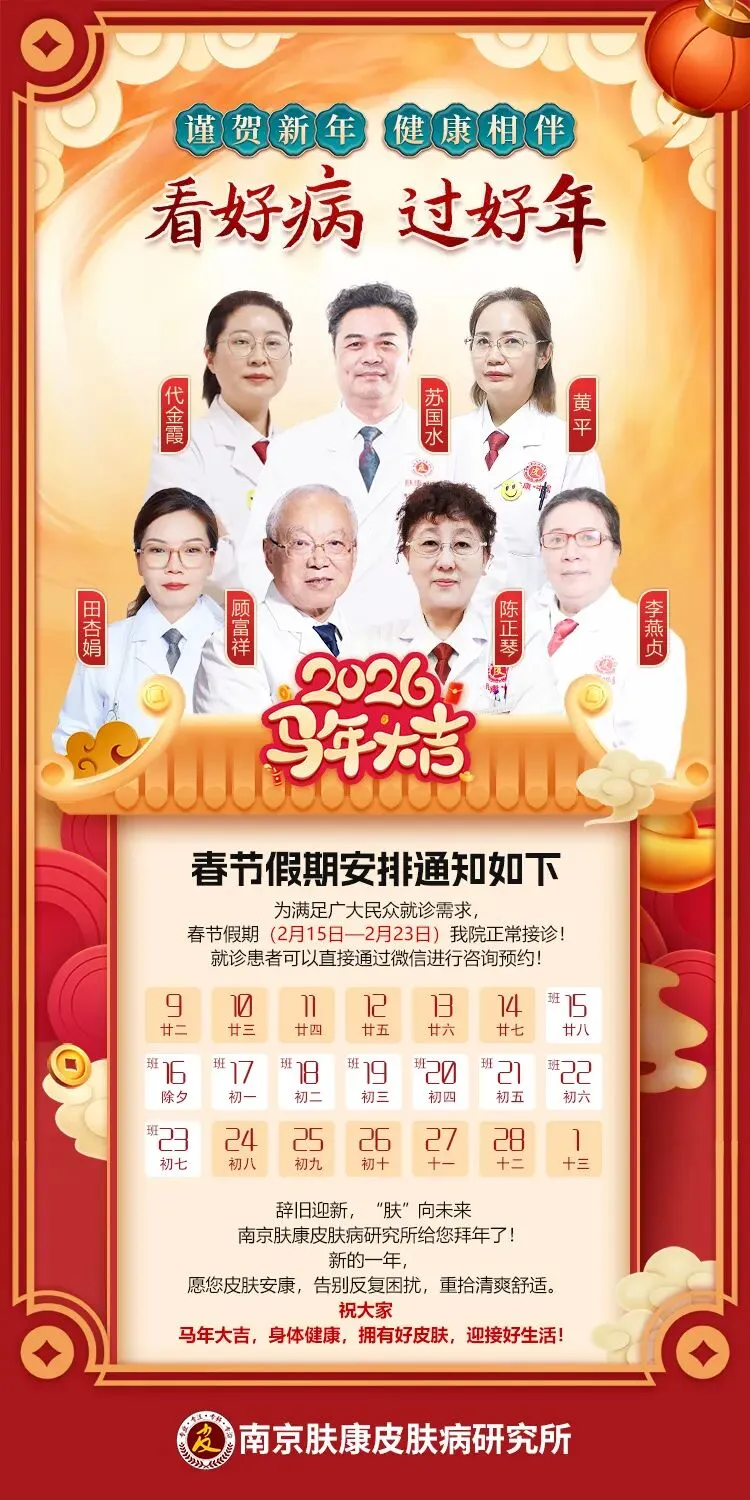 骏马迎春,守护不停!2026马年春节假期,为保障广大市民及皮肤病患者假期后就医需求,南京肤康皮肤病研究所特公布2月15日-2月23日(春节假期期间),资深专家团队正常在岗,可开展各类常见、慢性皮肤疾病诊疗服务,助力市民以健康肌肤开启马年新程,安心复工复产。