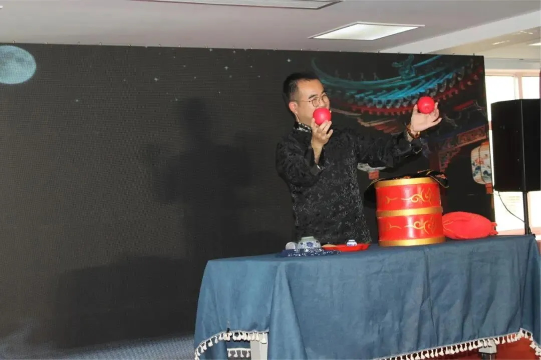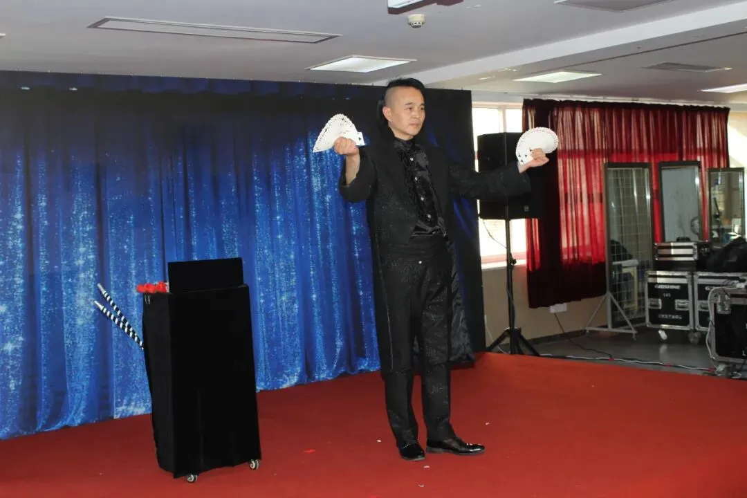 联谊会以全体成员唱响《同一首歌》暖场,在李雪萍主任及其团队温情演绎的小合唱《友谊地久天长》中拉开帷幕。随后,歌曲、舞蹈、朗诵、魔术、器乐等节目轮番登场,精彩不断。陈安亮主任与王芳老师的朗诵《可爱的中国》饱含深情,热兹宛古丽的《新疆舞》热情奔放,丁方瑜老师的《没那么简单》韵味深长,在医院社会服务部的大力支持与推荐下,我科特别邀请市杂技家协会邓云春、蔡敏功两位专业老师带来的魔术与古彩戏法更是引得满堂喝彩。特别值得一提的是,由华玥、单春燕老师表演的《八段锦》,巧妙融合了康复理念与传统文化,彰显了科室特色。