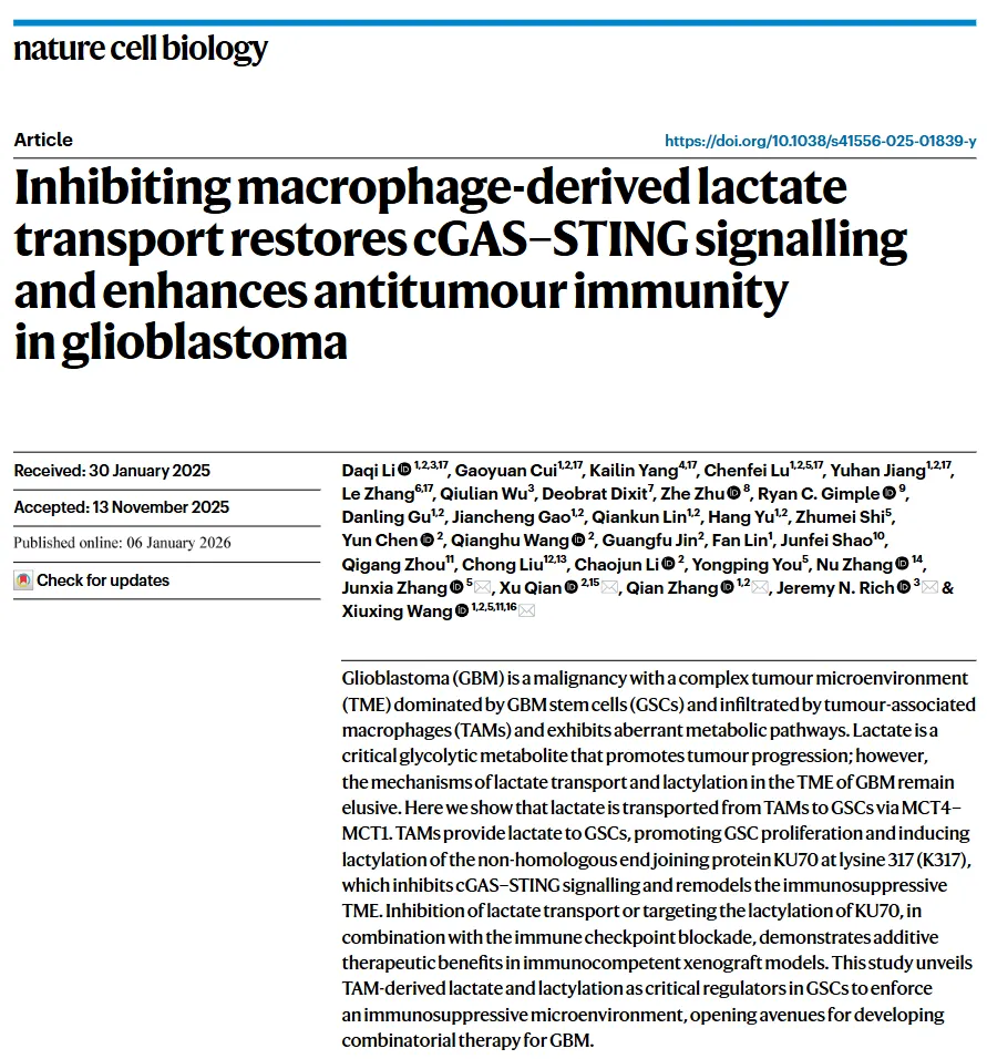 Li D, Cui G, Yang K, Lu C, Jiang Y, Zhang L, Wu Q, Dixit D, Zhu Z, Gimple RC, Gu D, Gao J, Lin Q, Yu H, Shi Z, Chen Y, Wang Q, Jin G, Lin F, Shao J, Zhou Q, Liu C, Li C, You Y, Zhang N, Zhang J, Qian X, Zhang Q, Rich JN, Wang X. Inhibiting macrophage-derived lactate transport restores cGAS-STING signalling and enhances antitumour immunity in glioblastoma. Nat Cell Biol. 2026 Jan 6. doi: 10.1038/s41556-025-01839-y. Epub ahead of print. PMID: 41495200.