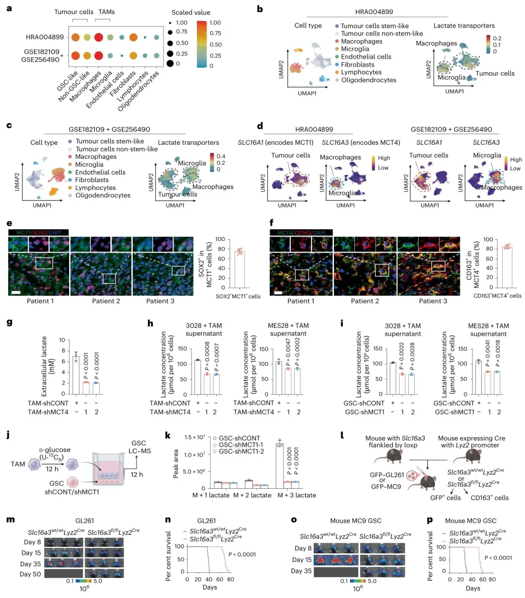 明确了 TAM 与 GSC 间乳酸转运的分子基础:TAMs 高表达 MCT4(SLC16A3),是乳酸的主要分泌者;GSCs 高表达 MCT1(SLC16A1),是乳酸的主要摄取者,MCT1/MCT4 的表达水平与 GBM 患者不良预后相关。
