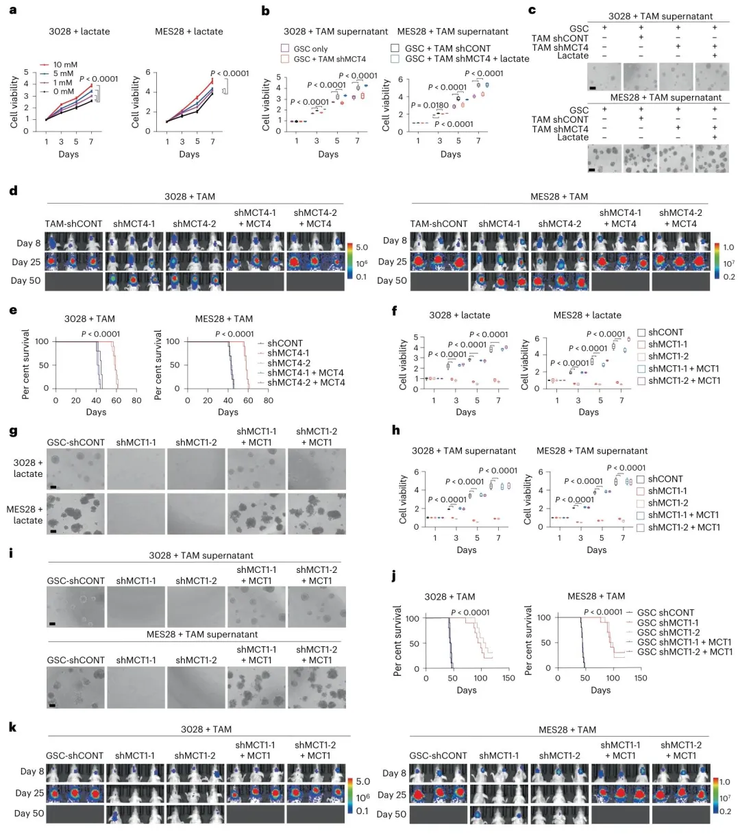 证实了乳酸转运的功能意义:体外实验显示,TAM 来源的乳酸可促进 GSC 增殖、神经球形成和干细胞标志物表达;体内实验中,髓系细胞特异性敲低 Slc16a3 或 GSC 敲低 SLC16A1,均能显著减少肿瘤组织中的乳酸积累,抑制肿瘤生长,延长荷瘤小鼠存活期。