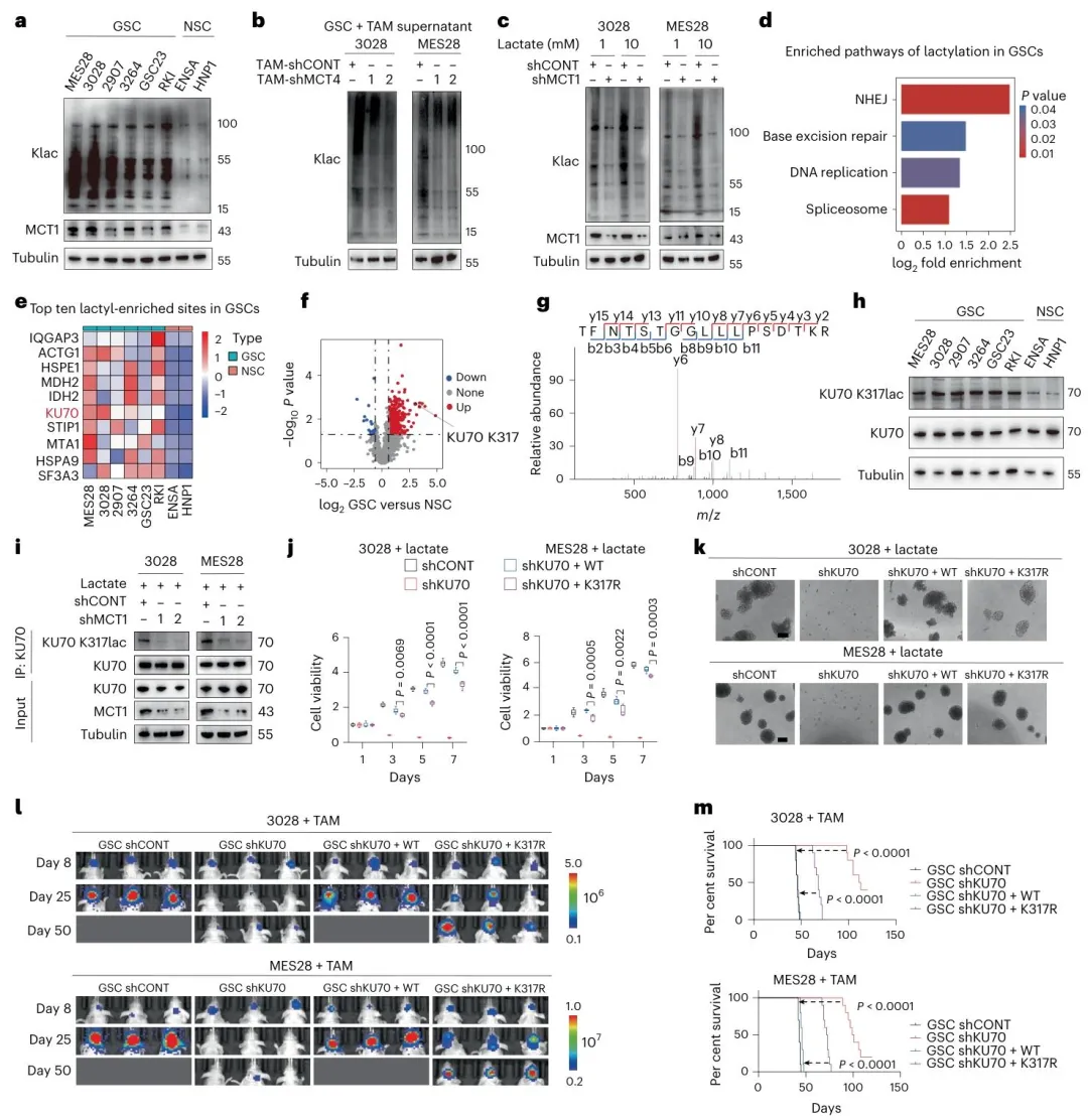 Figure 3:TAM 来源乳酸通过诱导 DNA 损伤修复蛋白 KU70 K317 乳酸化促进 GSC 增殖GSCs 的乳酸化水平显著高于正常神经干细胞(NSCs),敲低 MCT4 或 MCT1 可降低 GSC 的乳酸化水平;质谱分析鉴定到 NHEJ 通路蛋白 KU70 的 K317 位为关键乳酸化位点,该位点乳酸化在 GSCs 中特异性富集;敲低 KU70 或表达 KU70 K317R 突变体(无法乳酸化)可抑制 GSC 增殖和肿瘤形成,KU70 WT 回补可恢复;P300 是 KU70 K317 乳酸化的关键催化酶,CBP/KAT2B 不参与该修饰。