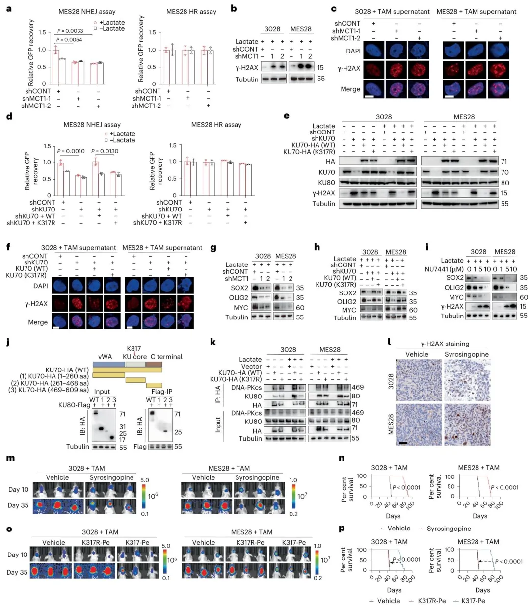 Figure 4:KU70 K317 乳酸化增强 NHEJ 功能并维持 GSC 干细胞特性敲低 MCT1 可削弱 GSC 的 NHEJ 修复能力,增加 γ-H2AX(DNA 损伤标志物)积累;KU70 K317 乳酸化可促进 KU70 与 KU80、DNA-PKcs 的结合,增强 NHEJ 复合物组装;敲低 MCT1 或表达 KU70 K317R 可降低 GSC 干细胞标志物 SOX2、OLIG2、MYC 的表达;NHEJ 抑制剂 NU7441 或 MCT1/MCT4 抑制剂叙利亚芸香碱(syrosingopine)可抑制 GSC 干细胞特性和肿瘤生长;靶向 KU70 K317 乳酸化的细胞穿透肽可延长荷瘤小鼠存活。