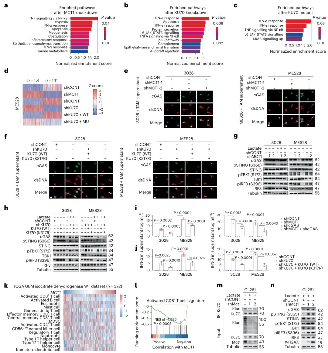 Figure 5:KU70 K317 乳酸化抑制 cGAS-STING 信号并维持免疫抑制性 TME敲低 MCT1、KU70 或表达 KU70 K317R 可激活 GSC 的 cGAS-STING 信号通路,增加 IFN-α/IFN-β 分泌;TCGA 数据库分析显示 MCT1 表达与 CD8+ T 细胞特征呈负相关;敲低小鼠胶质瘤细胞 GL261 的 Mct1 可降低 Ku70 乳酸化,激活 cGAS-STING 信号;Slc16a3 条件敲除小鼠模型中,TAM 分泌乳酸减少,GSC 干细胞特性降低,肿瘤组织中 CD8+ T 细胞浸润增加,巨噬细胞数量减少。