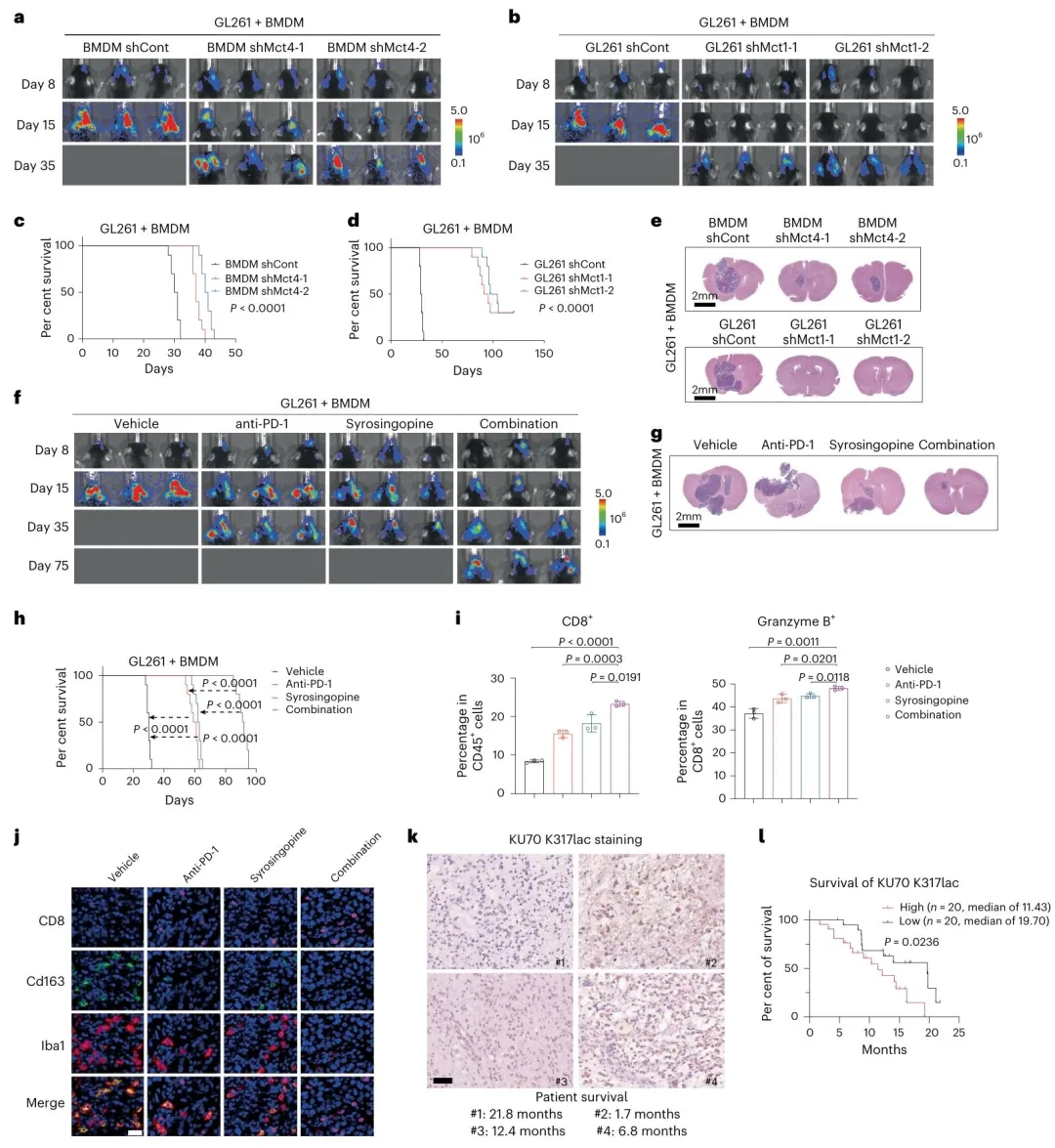 验证了联合治疗策略的有效性:在 GBM 模型中,MCT1/MCT4 抑制剂(叙利亚芸香碱)或 KU70 K317 乳酸化靶向肽,与 PD-1 抗体联合使用,可显著增强 CD8+ T 细胞浸润和细胞毒性,抑制 TAM 的促肿瘤表型,较单一治疗显著延长小鼠存活期,且人 GBM 样本中 KU70 K317 乳酸化高表达与不良预后相关。