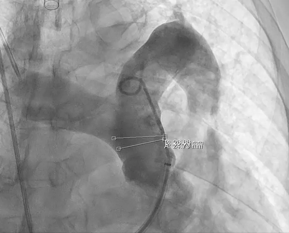 LAO0°+CRA20°造影体位测得主肺动脉直径约26mm