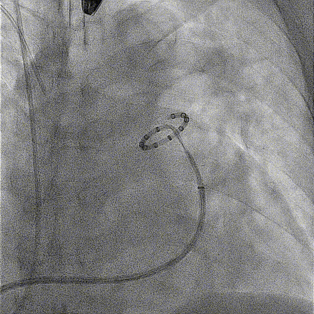 PADN 手术过程患者 PADN 手术前行右心导管检查示 RAP 16mmHg,PAP 51/20/30mmHg,PAWP 21mmHg,PVR 2.42wood,测量肺动脉主干直径约 26mm。根据消融导管圈径:肺动脉主干直径 = 1:1.1-1.2,选择 30mmPADN 导管。术者通过导管贴靠三个目标靶点进行消融,消融过程顺利。
