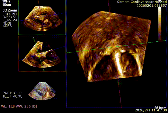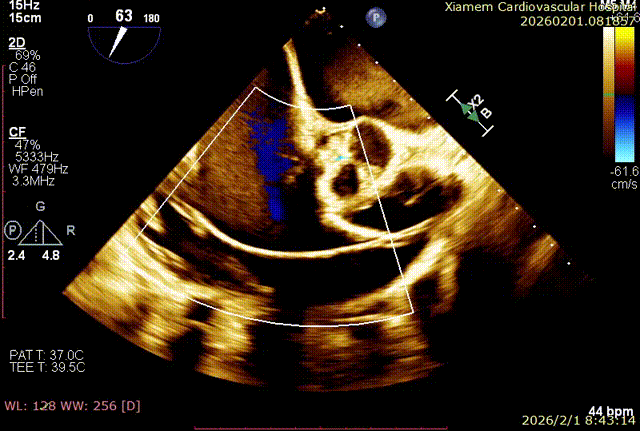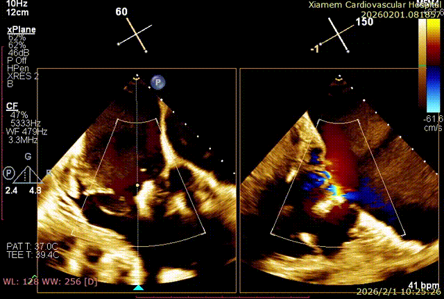 第一个夹子释放后,在前叶、隔叶间靠近中央区仍有残余反流,所以决定再植入一枚 6mm 夹合器。第二枚夹合器抓捕瓣叶过程中,受到第一枚夹合器影响,无法清晰的在 X-plane 切面上进行瓣叶捕获,因此改用 3D-MultiView 切面顺利抓捕,关闭夹合器后残余反流已经由术前极重度(4+)减小为轻中度(2+),手术过程流畅,手术结果完美。