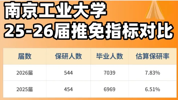 南京工业大学2026届共保研544人,26届毕业6945人(实际毕业7039人,但专转本、专升本不可保研,因此删除),保研率约7.83%。