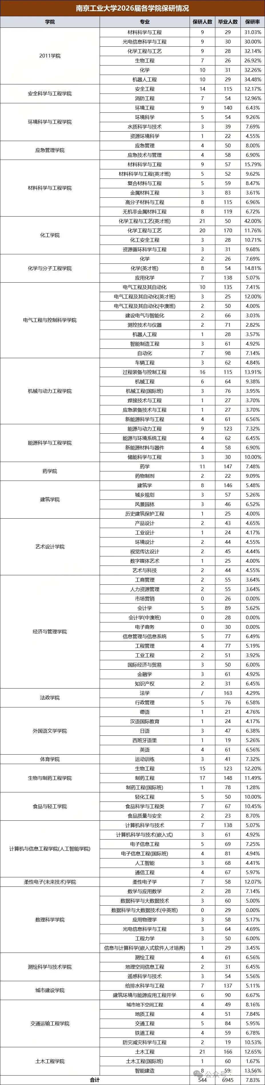 免费订阅江苏升学信息江苏考帮按:高考录取数据是考生填报志愿的重要参考,同样大学保研情况也是未来深造就业的重要推举!今天江苏考帮分享南京工业大学各学院2026届保研数据,一起来看看各学院各专业保研如何?