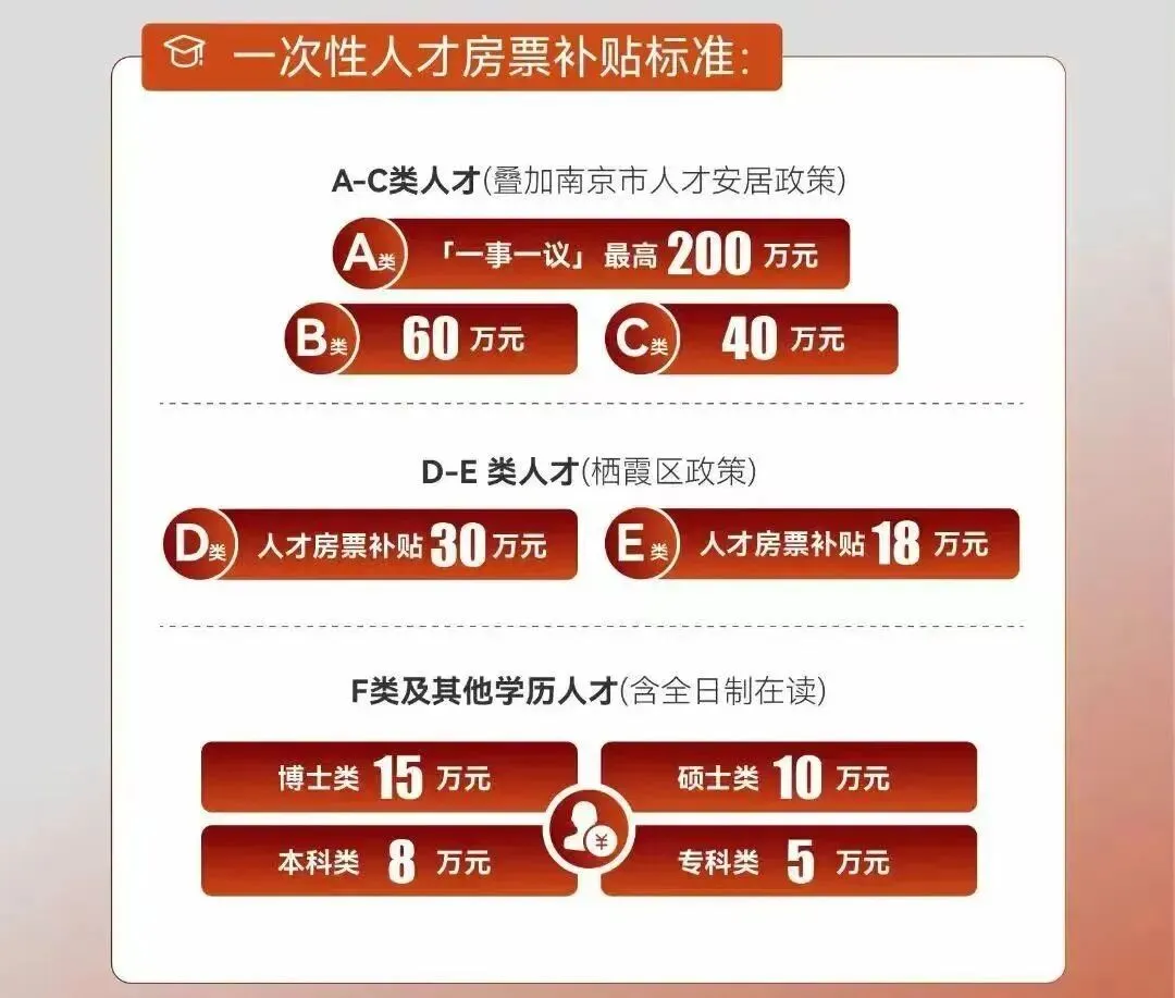 额外奖励:A至C类人才在享受南京市人才安居补贴政策基础上,“一事一议”再给予最高300万元人才房票补贴;对鼓楼区认定的其他青年人才,补贴标准在基础额度上增加50%,即大专学历4.5万元/人,本科学历9万元/人,硕士研究生学历15万元/人,博士研究生学历22.5万元/人