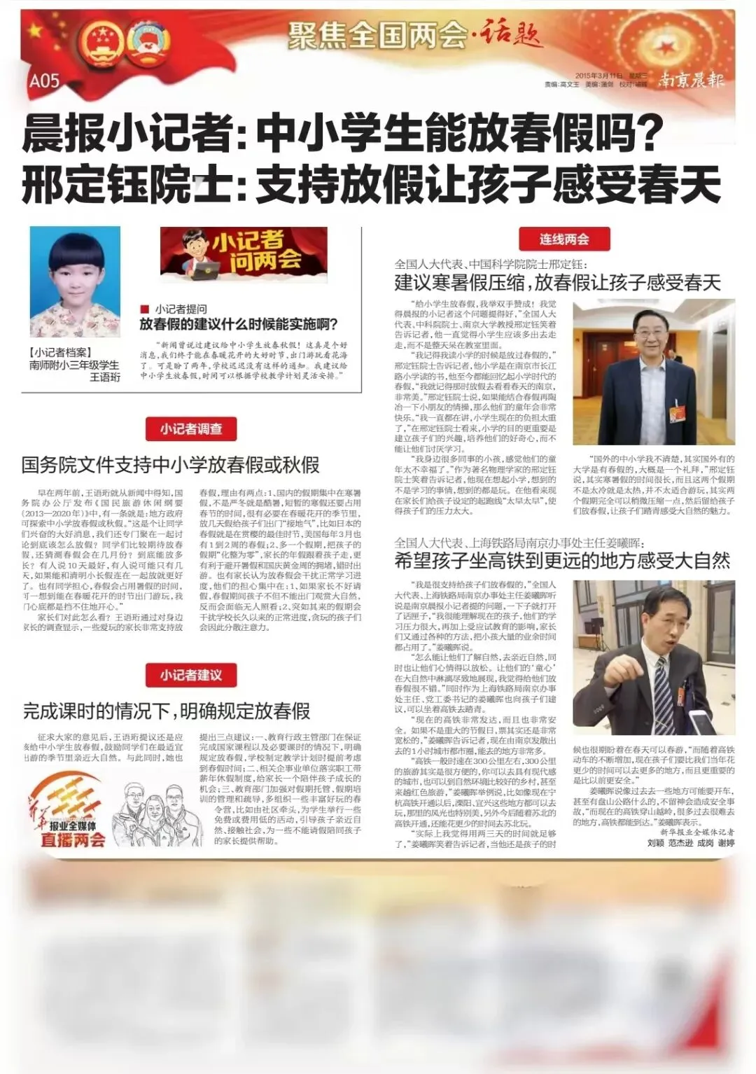 “给小学生放春假,我举双手赞成!我觉得晨报的小记者这个问题提得好。”当年全国人大代表、中国科学院院士、南京大学教授邢定钰表示,他一直觉得小学生应该多出去走走,而不是整天呆在教室里面。