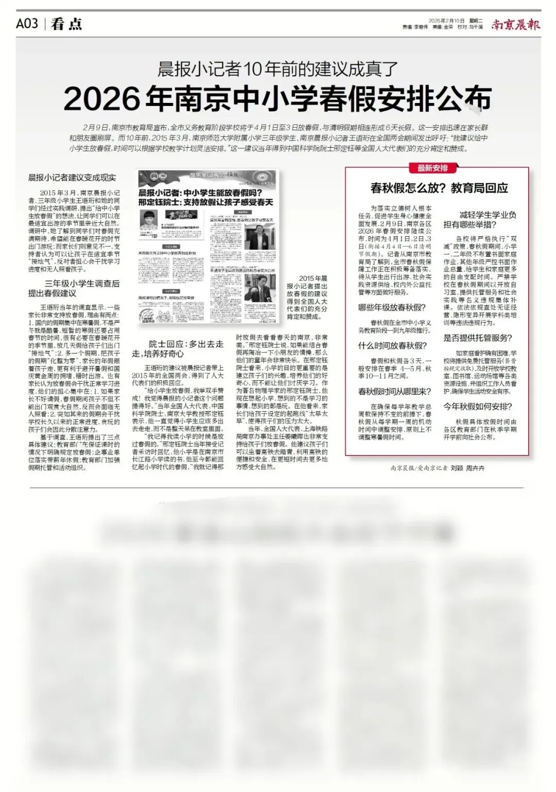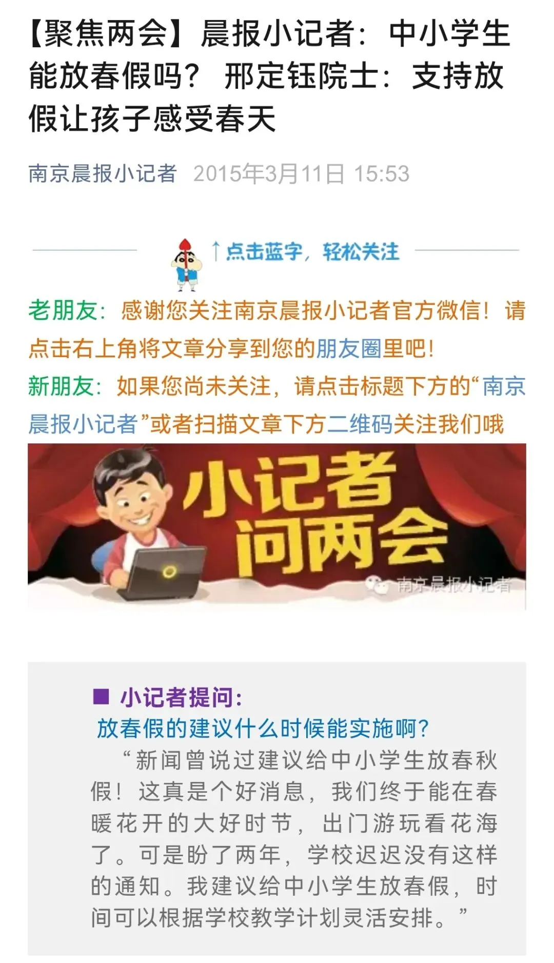 而10年前,2015年3月,南京师范大学附属小学三年级学生、南京晨报小记者王语珩在全国两会期间发出呼吁:“我建议给中小学生放春假,时间可以根据学校教学计划灵活安排。”这一建议当年得到中国科学院院士邢定钰等全国人大代表们的充分肯定和赞成。