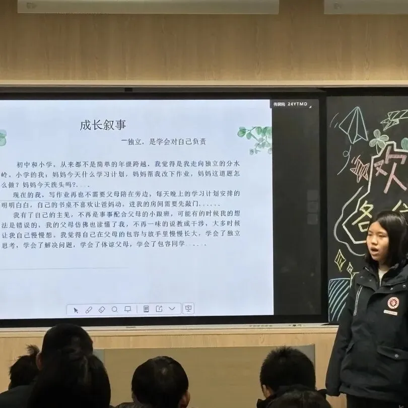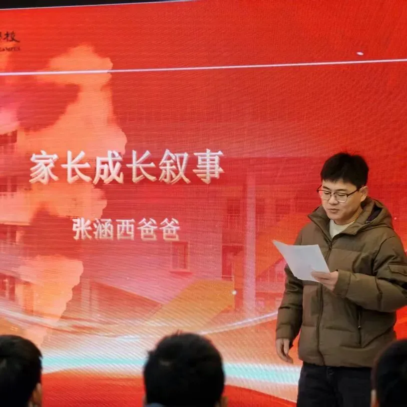 2502班的庆典,以一份沉稳庄重的仪式感,开启了这场成长与陪伴的深度对话。学生主持人从容登台、从容表达,为整场活动定下走心、务实的基调。成长叙事环节,学生代表沉着冷静地分享了自己攻克学习难点的坚持、对自身不足的反思,以及在集体生活中学会的责任与担当,每一段讲述,都彰显着少年的成长与蜕变。班主任带领家长和孩子一同回望本学期的共同历程,家长代表真挚的育儿分享,句句皆是心里话,引发全场家长的深度共鸣。