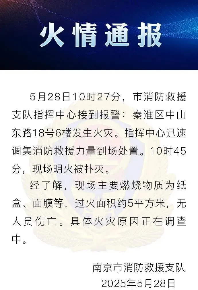 @南京消防发布火情通报:5月28日10时27分,@南京消防指挥中心接到报警:秦淮区中山东路18号6楼发生火灾。指挥中心迅速调集消防救援力量到场处置。10时45分,现场明火被扑灭。经了解,现场主要燃烧物质为纸盒、面膜等,过火面积约5平方米,无人员伤亡。具体火灾原因正在调查中。 来源:@南京消防、现代快报
