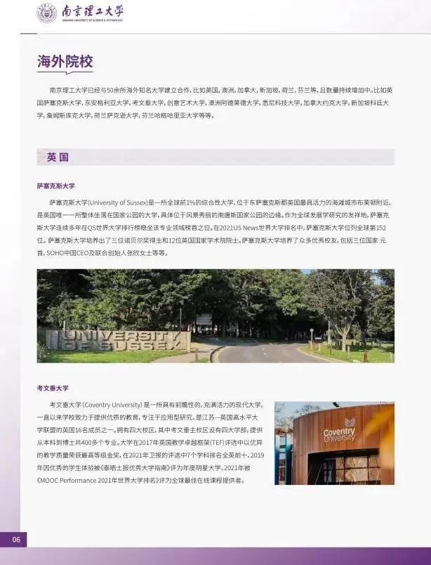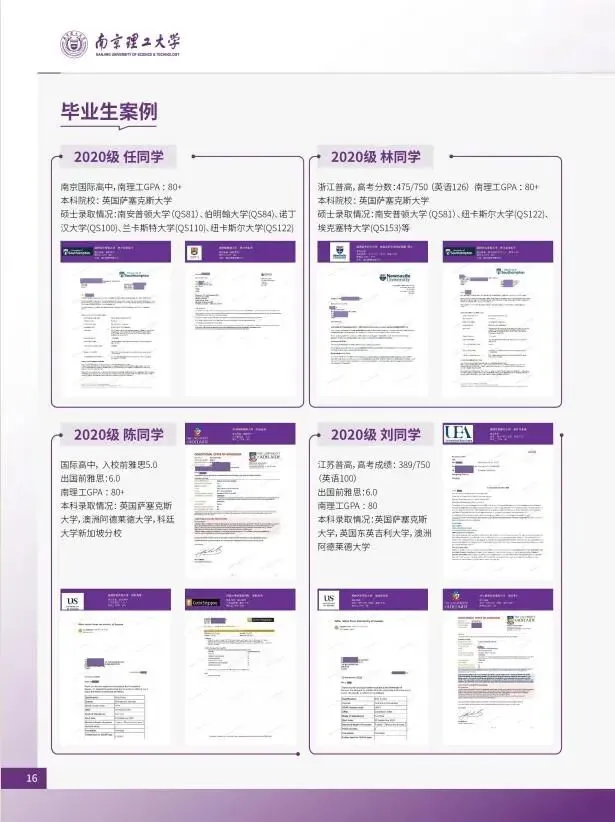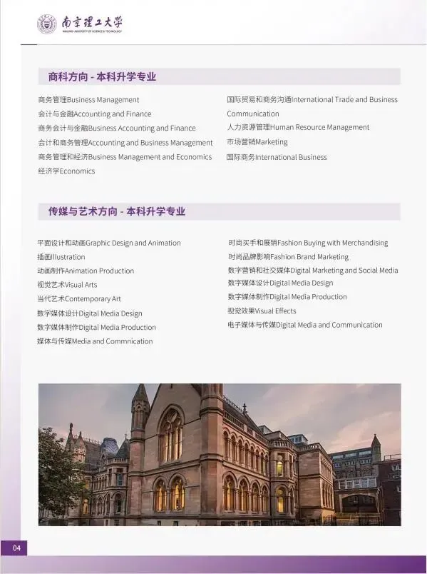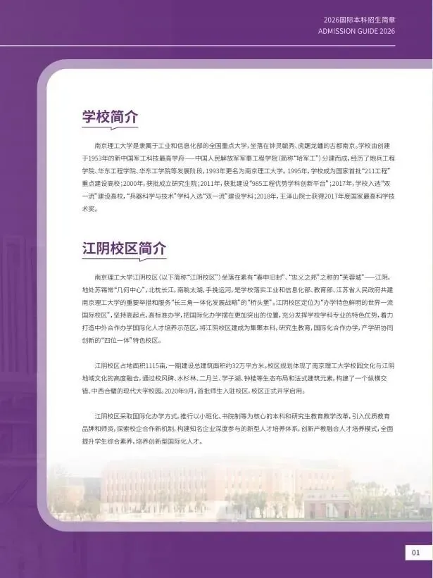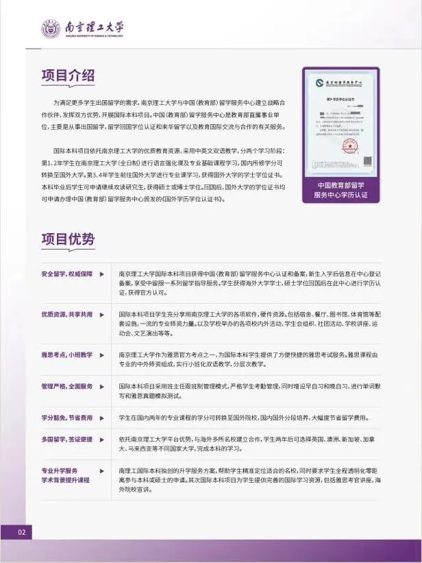 位,主要是从事出国留学,留学回国学位认证和来华留学以及教育国际交流与合作的有关服务。国际本科项目依托南京理工大学的优质教育资源,采用中英文双语教学,分两个学习阶段:第1、2年学生在南京理工大学(全日制)进行语言强化课及专业基础课程学习,国内所修学分可转换至国外大学。第3、4年学生前往国外大学进行专业课学习,获得国外大学的学士学位证书。本科毕业后学生可申请继续攻读研究生,获得硕士或博士学位。回国后,国外大学的学位证书均可申请办理中国(教育部)留学服务中心颁发的《国外学历学位认证书》。