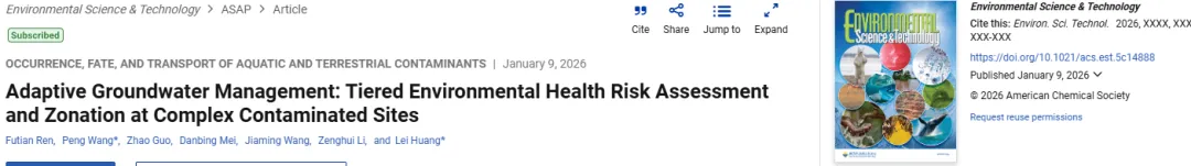 导语:近期,环境科学顶级期刊Environmental Science & Technology(IF=11.3,中科院1区TOP,自然指数期刊)发表题为“Adaptive Groundwater Management: Tiered Environmental Health Risk Assessment and Zonation at Complex Contaminated Sites”的论文,实现复杂地下水系统混合毒物风险的分级量化与精准分区。