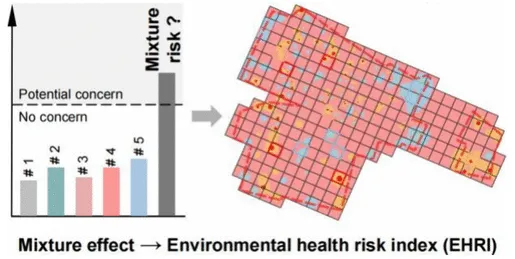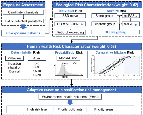 摘要:本研究整合长江下游化工园区367个监测点101.659万条季度浓度数据(277种毒物),构建环境健康风险指数(EHRI),融合生态风险(浓度加和→响应加和模型)与人类健康风险(蒙特卡洛模拟)。结果显示,仅≤10%的毒物(无机物、金属、BTEXs、卤代烷等)贡献>95%累积EHRI。象限分析识别四类共存模式,其中高频-高浓度毒物(如NH3-N、As、Mn)主导风险。空间插值显示,基线EHRI>0.60的高风险区达19 km²,但移除45种关键毒物后缩减至<0.1 km²(降幅99%)。提出的“源-羽流-缓冲带”分级管控框架,为全球地下水混合污染治理提供可转移方案。