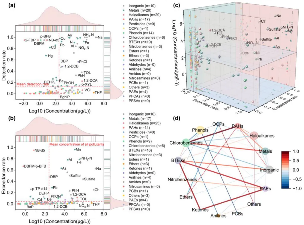 图2. 毒物检测率(a)、超标率(b)与对数浓度关系;三维参数空间(c)突出高风险毒物;相关性网络(d)揭示共存模块