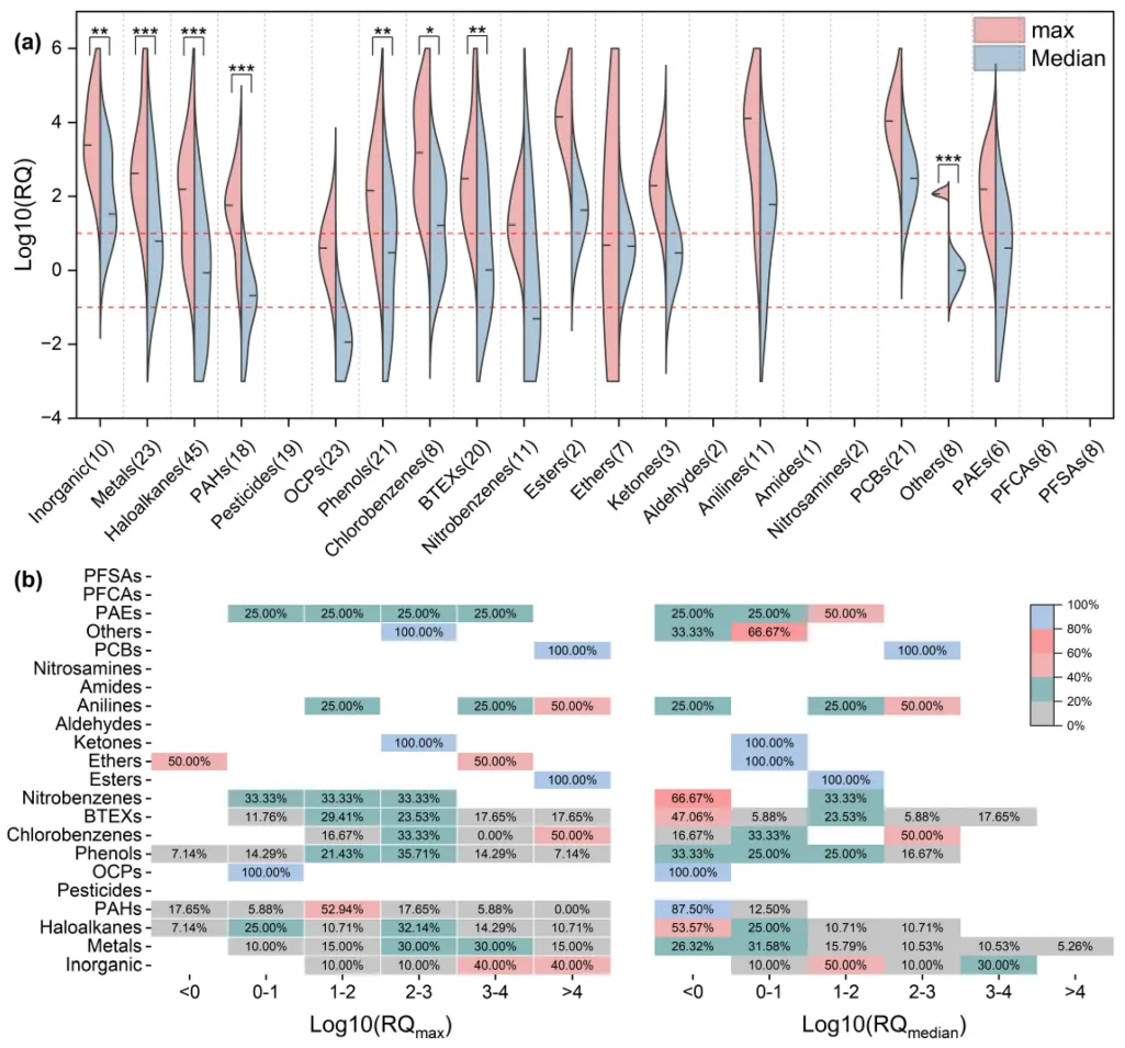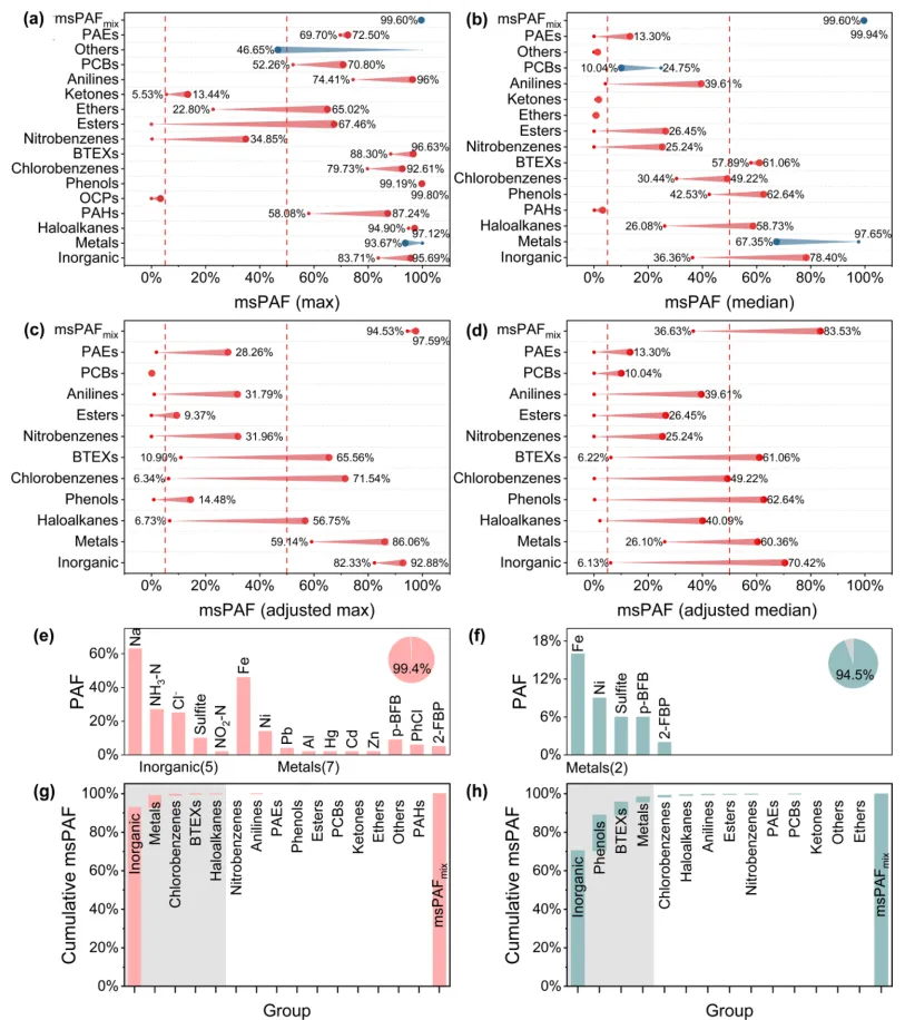 图4. 毒物组混合风险:峰值(a,b)与中值(c,d)暴露下msPAF;加权后(e,f)高贡献毒物占比;逐步累积风险(g,h)