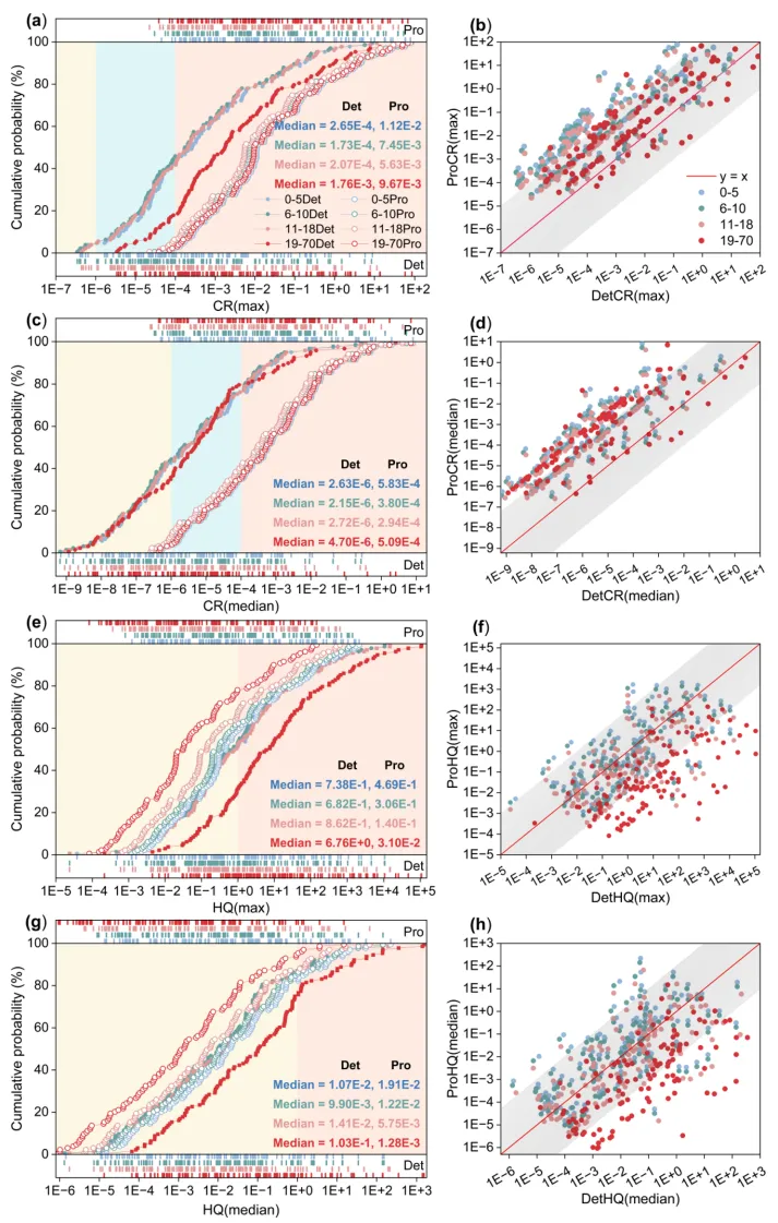 图5. 四年龄组健康风险:确定性(Det)与概率性(Pro)评估对比,阴影区标记可接受风险范围