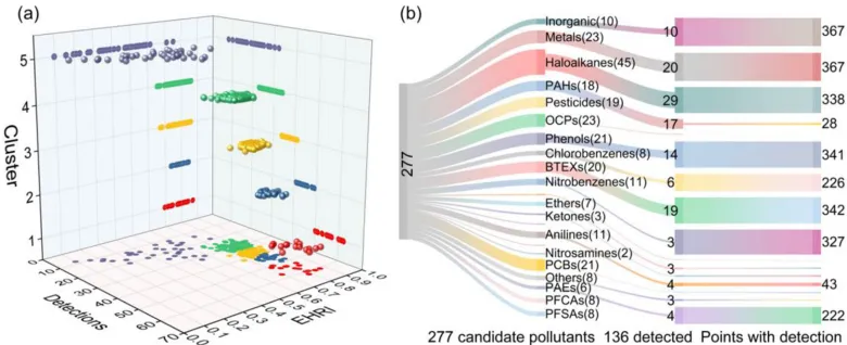 图6. 监测点三维自组织映射(SOM)聚类:X轴(毒物数量)、Y轴(EHRI)、Z轴(聚类);桑基图展示毒物-监测点关联。