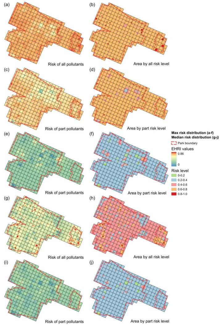 图7. 网格级EHRI在毒物逐步移除前后变化:全毒物(a,b)、移除无机物/金属(c,d)、追加移除top15有机毒物(e,f);中值条件对比(g-j)