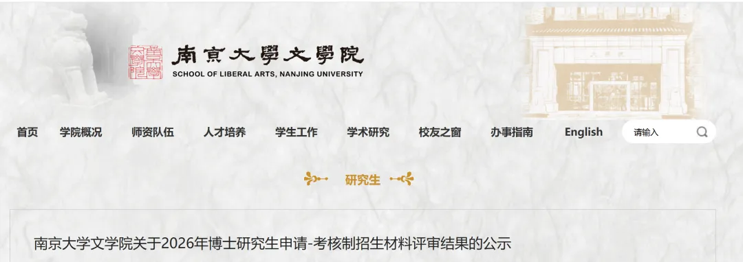 根据《南京大学2026年博士研究生招生章程》及《南京大学文学院2026年博士研究生(学术学位)“申请-考核制”招生选拔实施细则》《南京大学文学院2026年博士研究生(专业学位)“申请-考核制”招生选拔实施细则》的规定,文学院研究生招生分委会制定审核细则,经院研究生办公室、院博士研究生申请考核材料专家评审组审定,确定以下考生通过材料审核,进入下一阶段考核。综合考核初步定于2026年3月5月-3月7日(其中3月5日下午来校报道,3月6日-3月7日两天考核),具体的考试安排将通过学院网站公告及邮件的方式进行通知,请考生关注学院官网及报名时预留的邮箱,及时查阅具体考核安排。注: