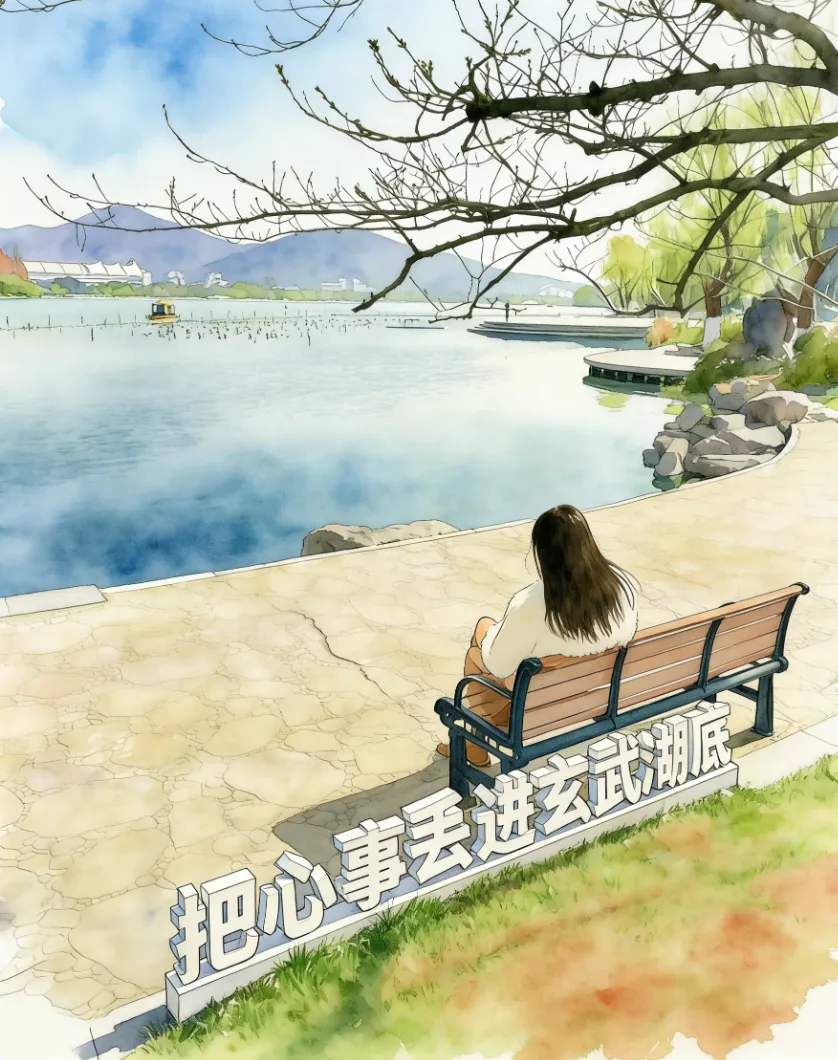在自然盛景之外,“米芾拜石”旁有一处隐秘的青年男女打卡地——“把心事丢进玄武湖底”。一方树下少女倚坐于长椅,任由长发披落,情爱烦恼皆随风而去,这“放下”倒是彻底妥当了。