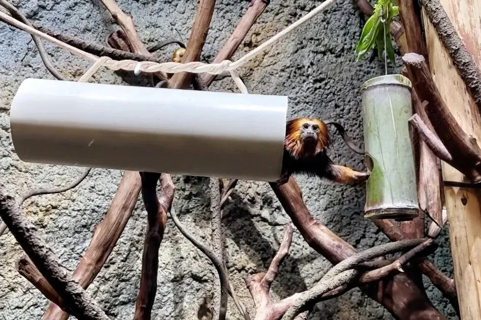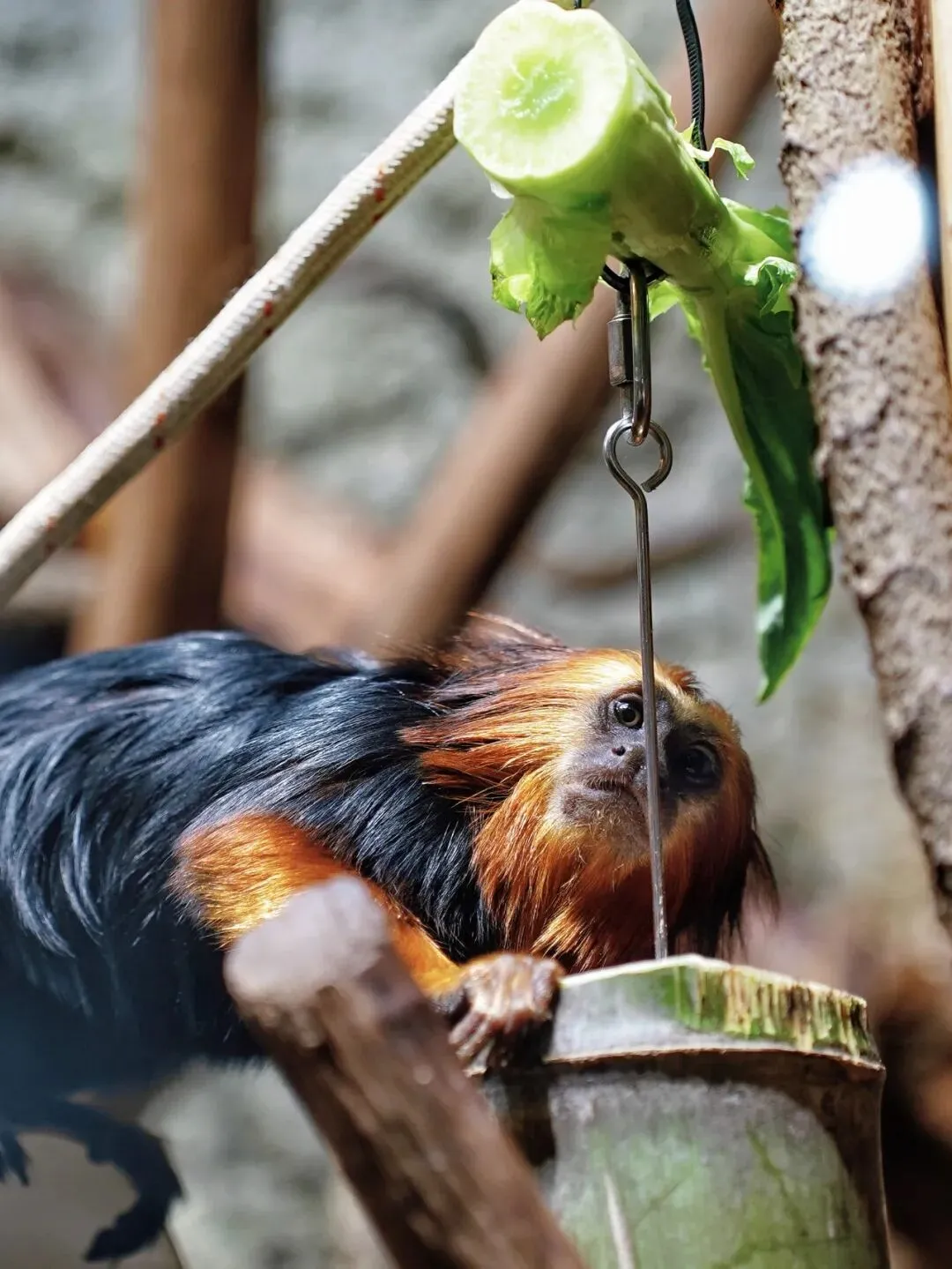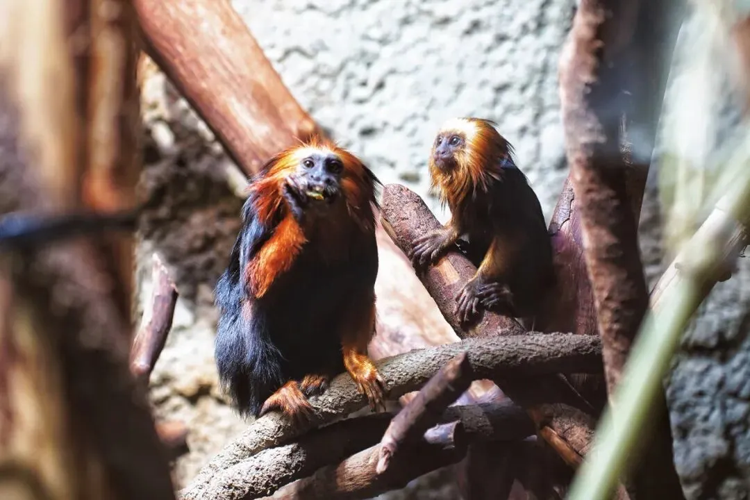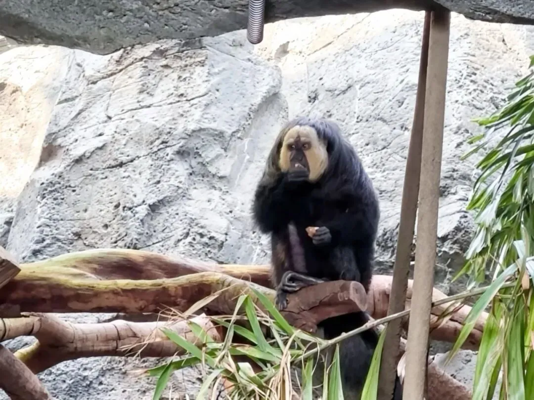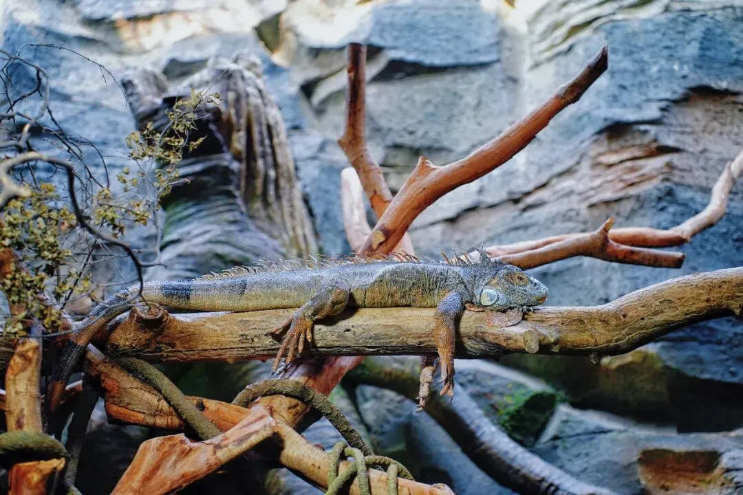 你还能看见不同物种同框的神奇画面,在「冈瓦纳」展区,松鼠猴和蜥蜴共享一个“房间”,蜥蜴趴在粗壮的树枝晒日光浴,松鼠猴灵活穿梭于细枝间,偶尔路过还调皮地拨弄几下蜥蜴的大尾巴。这两个物种,一个好动,一个喜静,居然能如此完美地混养在一起,令人惊叹。
