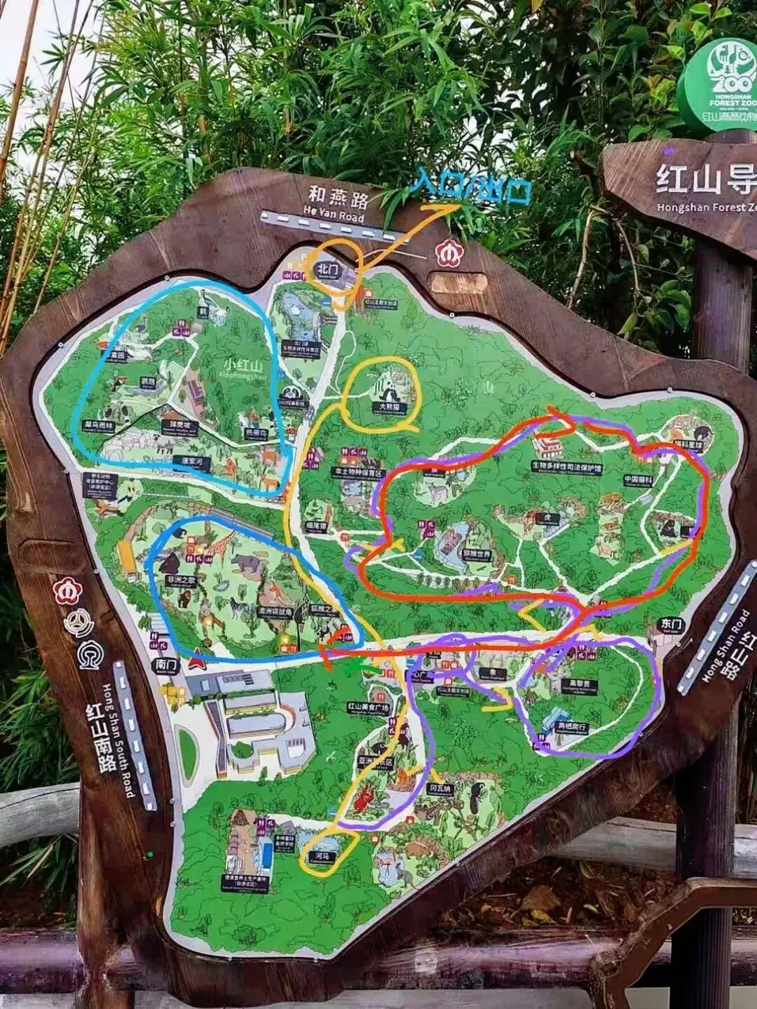 红山动物园有南北两个门,最省力的路线是从南门进,有自助电瓶车代步,但会错过一些展区,所以我选择了北门进的经典路线。我们坐观览车到最深处的河马馆后,往回一路游览,下坡多一些,相对好走。