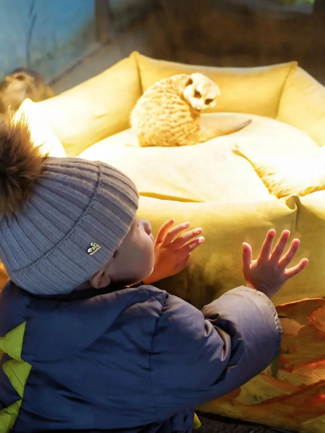 想看狐獴吗?那就弯腰低头,像狐獴一样钻进长长的洞穴,透过金字塔形状的玻璃穹顶,寻找它们的身影吧,好像你也成了它们的一员,正在站岗放哨。