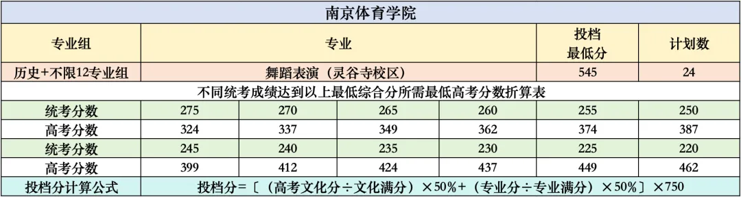 南京体育学院2025年舞蹈类录取最低分及专业/文化分段表