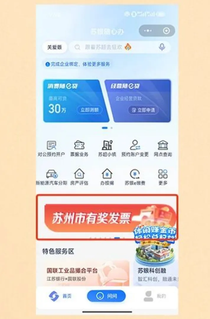 2、进入“苏银随心办”主页,点击“苏州市有奖发票”模块。