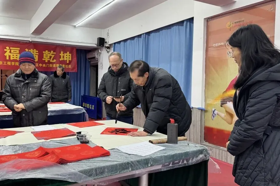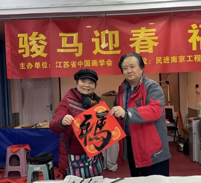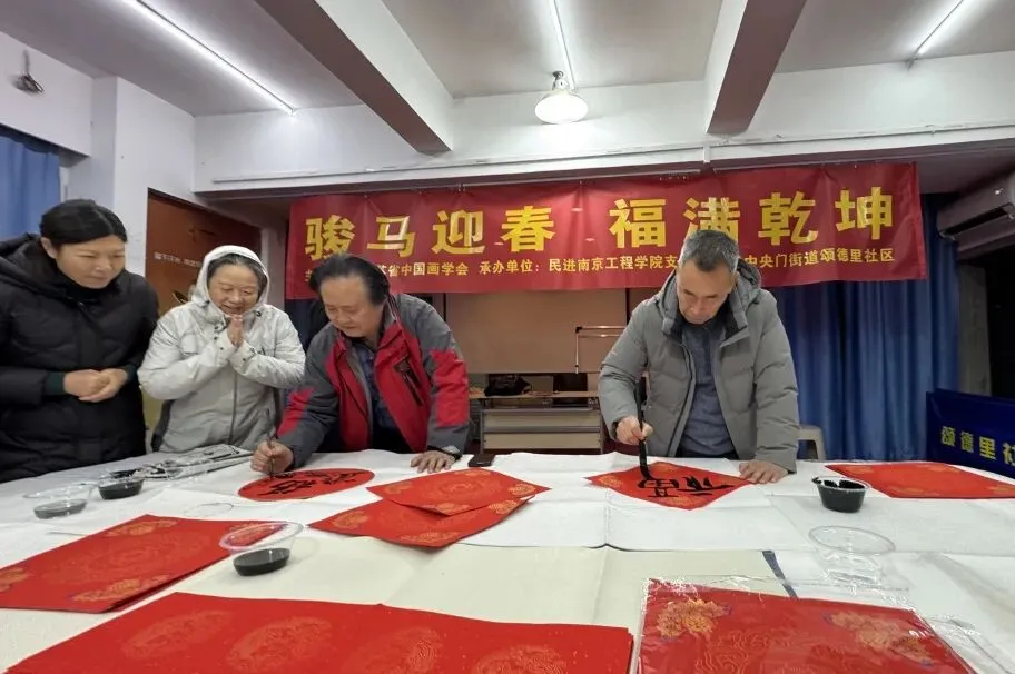2月10日上午,也是小年。中央门街道颂德里社区里暖意融融、墨香扑鼻,处处都是浓浓的年味儿。由江苏省中国画学会主办,民进南京工程学院支部和颂德里社区联合承办的“骏马迎春 福满乾坤——送福进社区”活动热闹开场,数位知名艺术家走进社区,和居民们面对面写春联、送福字,把高雅的书画艺术送到家门口,也把满满的新春祝福送到了大家的心坎里,让这个小年过得格外有意义。活动现场,几张长桌整齐铺开,大红的宣纸、乌黑的墨汁摆放整齐,江苏省中国画学会党支部书记、学术委员会委员张广才,学会理事王昊、谷明露,民进南京工程学院支部副主委金友功,中国书法家协会会员、江苏省刻字委副主任李志勤,南京工程学院教授宋维宁,江苏省书法家协会会员曹卫明等艺术界人士齐聚现场研墨挥毫。只见毛笔在宣纸上灵动游走,一笔一划间,俊逸洒脱的春联、寓意吉祥的国画小品、圆润饱满的“福”字接连诞生,每一幅作品都透着浓浓的年味和真诚的祝福。