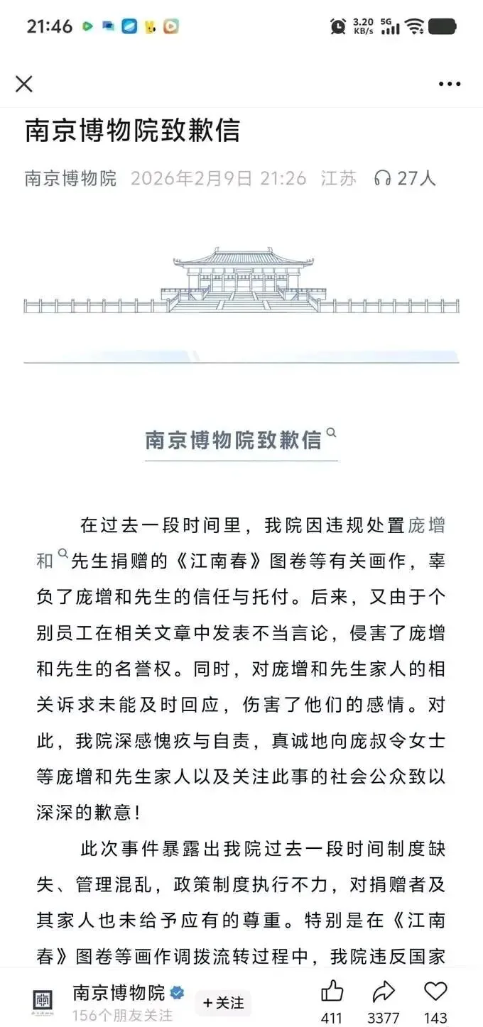 2026年春节前夕,江苏省委省政府终于发布了关于南京博物院(南博)文物流失事件的调查通报。表面上看,这是一次“雷霆问责”:29人被追责,4幅画作回归,《江南春》图卷重回库房,南博公开致歉,全省开展文物安全大整治……一切似乎都在“依法依规”中走向圆满。