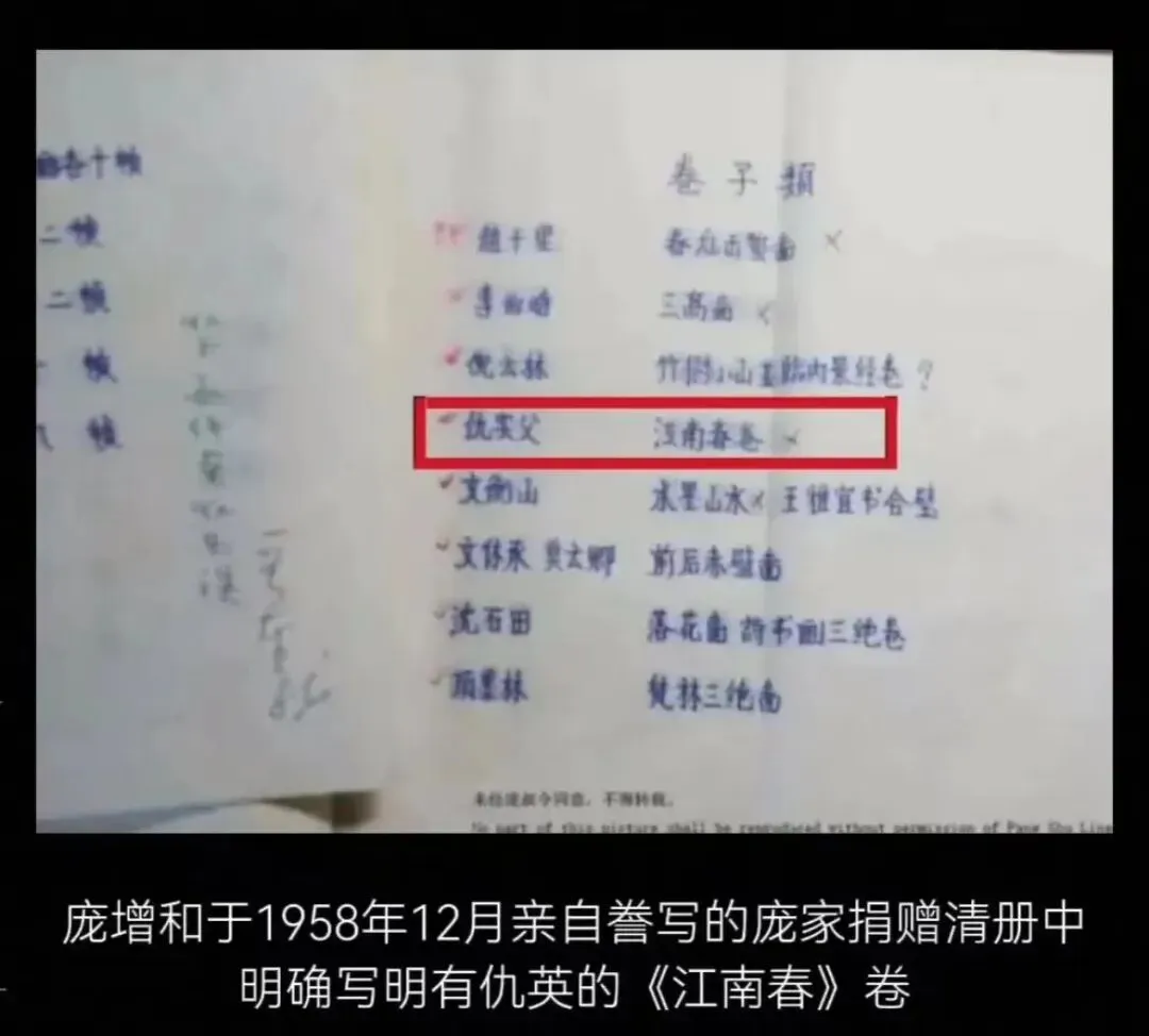 1959年,收藏大家庞莱臣之孙庞增和,将家族珍藏的137件古画无偿捐赠给了南京博物院,其中就包括传为明代画家仇英所作的《江南春》图卷。