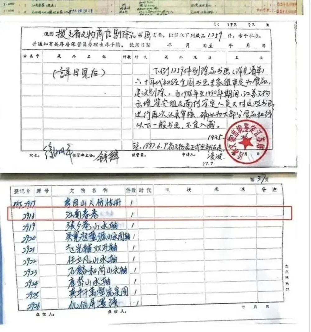 然而,时任常务副院长徐湖平却未按规定履行这些程序,直接违规签批了将包括《江南春》在内的5幅捐赠画作,调拨至原江苏省文物总店用于销售的申请。