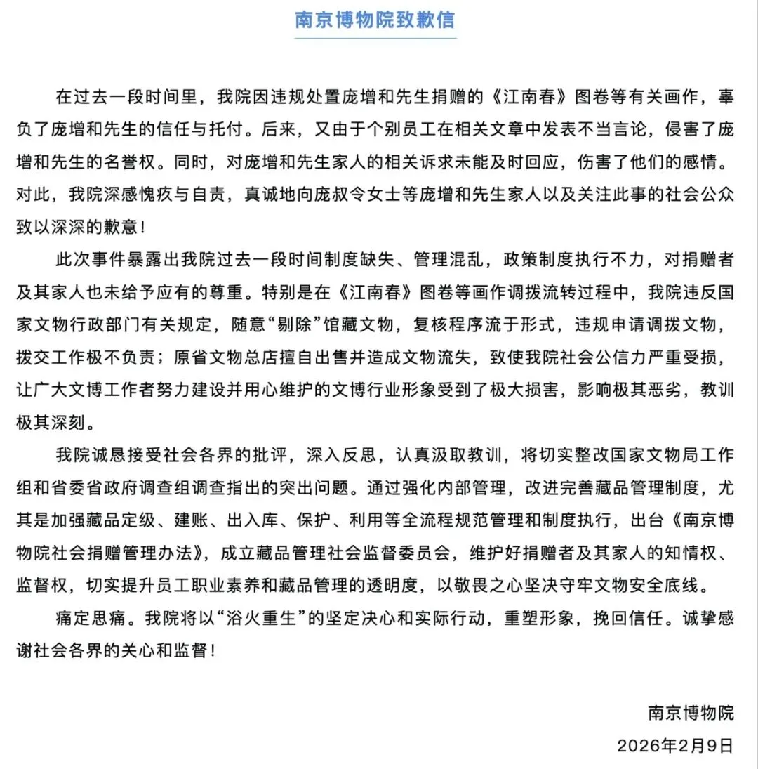 南京博物院也向社会和捐赠人发出了道歉信,承诺将深刻整改。