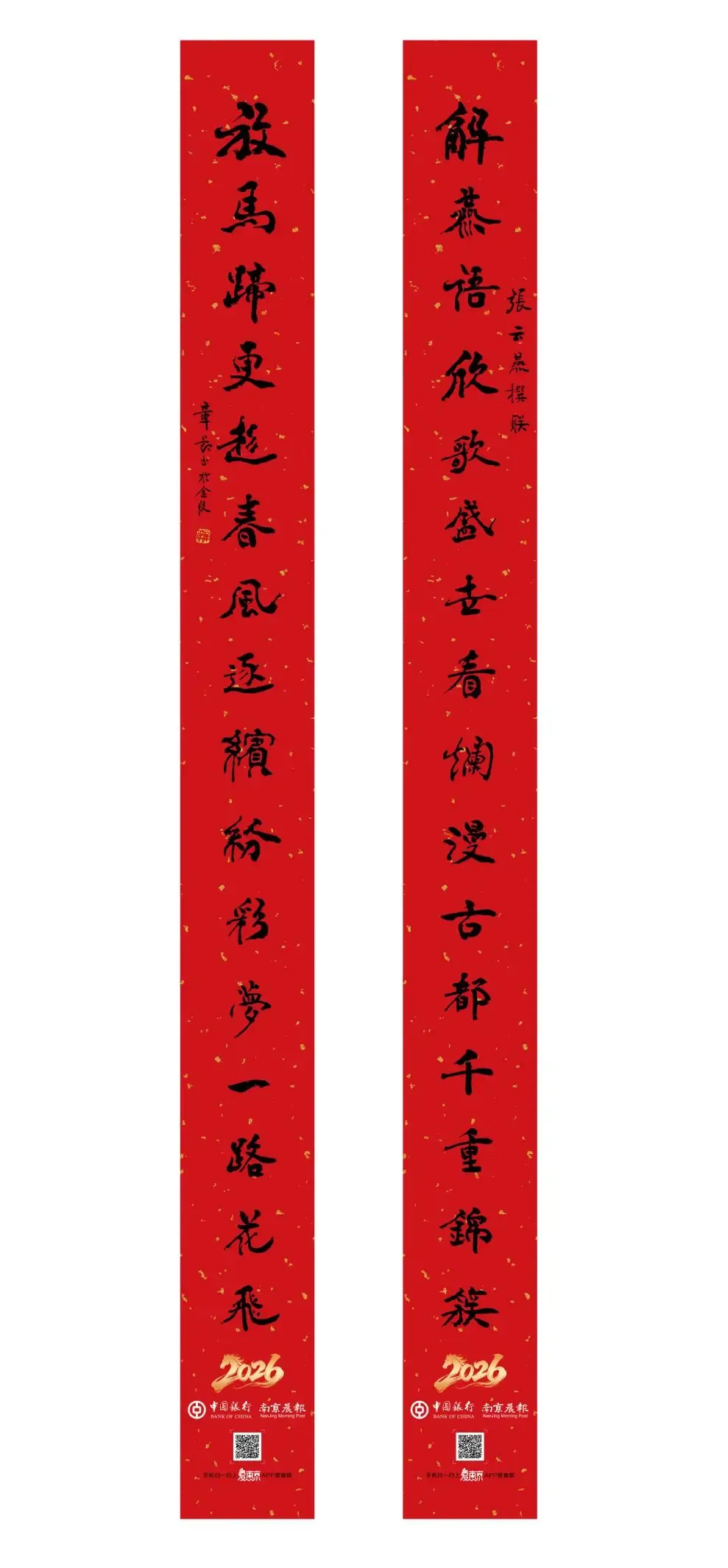 “解燕语欣歌盛世,看烂漫古都,千重锦簇;放马蹄更趁春风,逐缤纷彩梦,一路花飞。”在2026年第十一季“城门挂春联 南京开门红”活动中,今年93岁高龄的国家一级美术师、中国书法家协会原理事、江苏省书协原副主席兼秘书长、江苏省楹联研究会原副会长章节再次挥毫,第八次为解放门执笔,自第一季到现在的十一年间,从评联到写联,他以笔墨为桥,让650多年的古城墙与中华文脉在新春时节完成一次次深情对话。