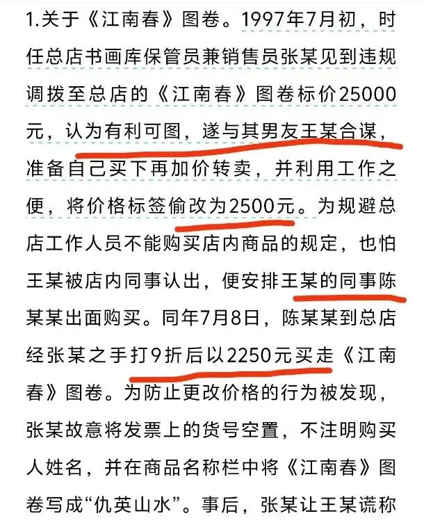 张某见《江南春》标价仅25000元,就偷偷将标签改为2500元,然后安排其男友的同事以九折价2250元买走,再与另外两幅画一起,以12万元的价格卖给南京艺兰斋创始人陆挺;