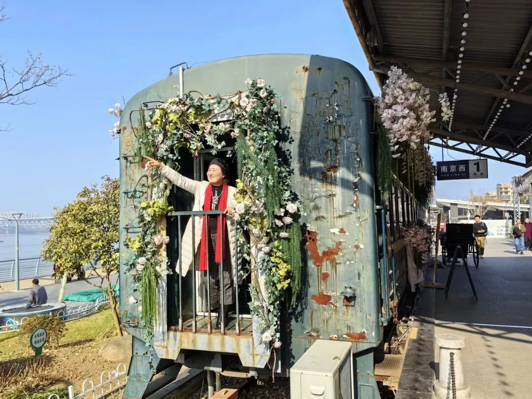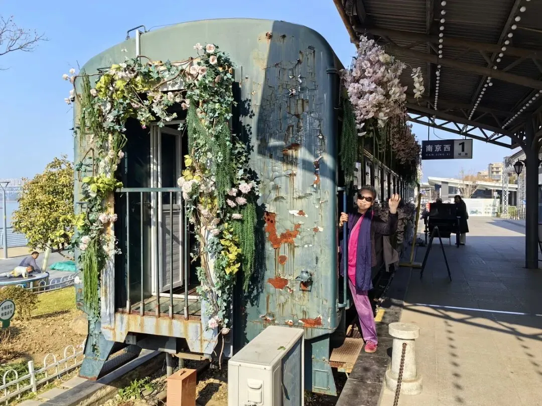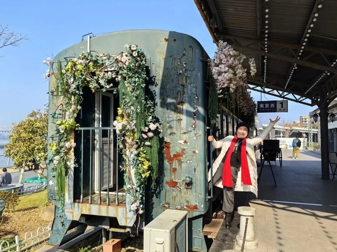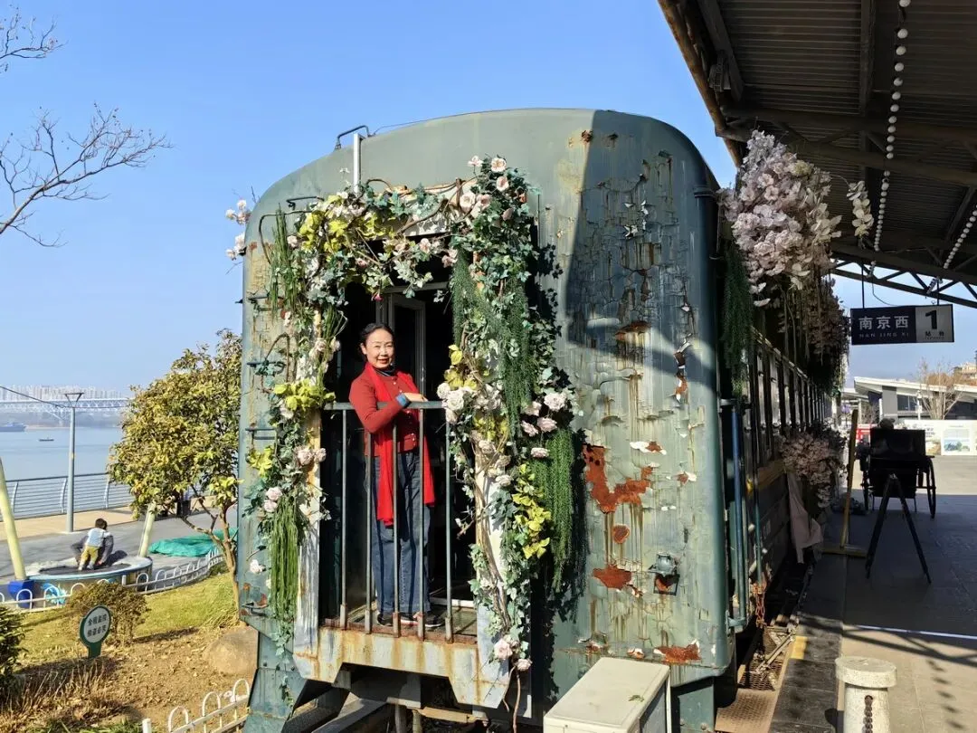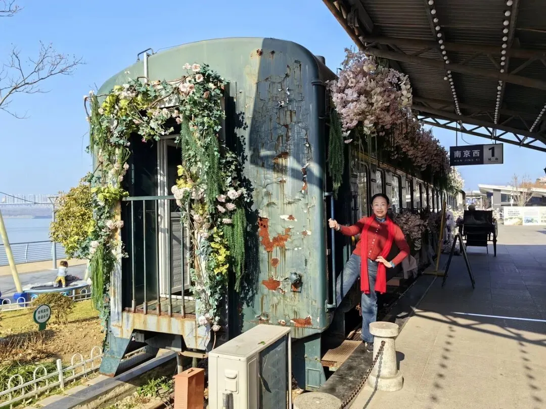 下午活动结束后,我们仨人来到酒店门前的“问渡苑下关火车主题园”游览。该园是依托南京铁路轮渡栈桥旧址改建的免费开放公园,以绿皮火车、民国站台等铁路元素为核心,融合历史文化和滨江风光打造的怀旧打卡地。我们漫步在江边,经过锈迹斑斑的铁轨,来到火车老式站台,登上绿皮火车,身临其境地感受到历史的厚重与现代的融合,我们不由驻足拍照。
