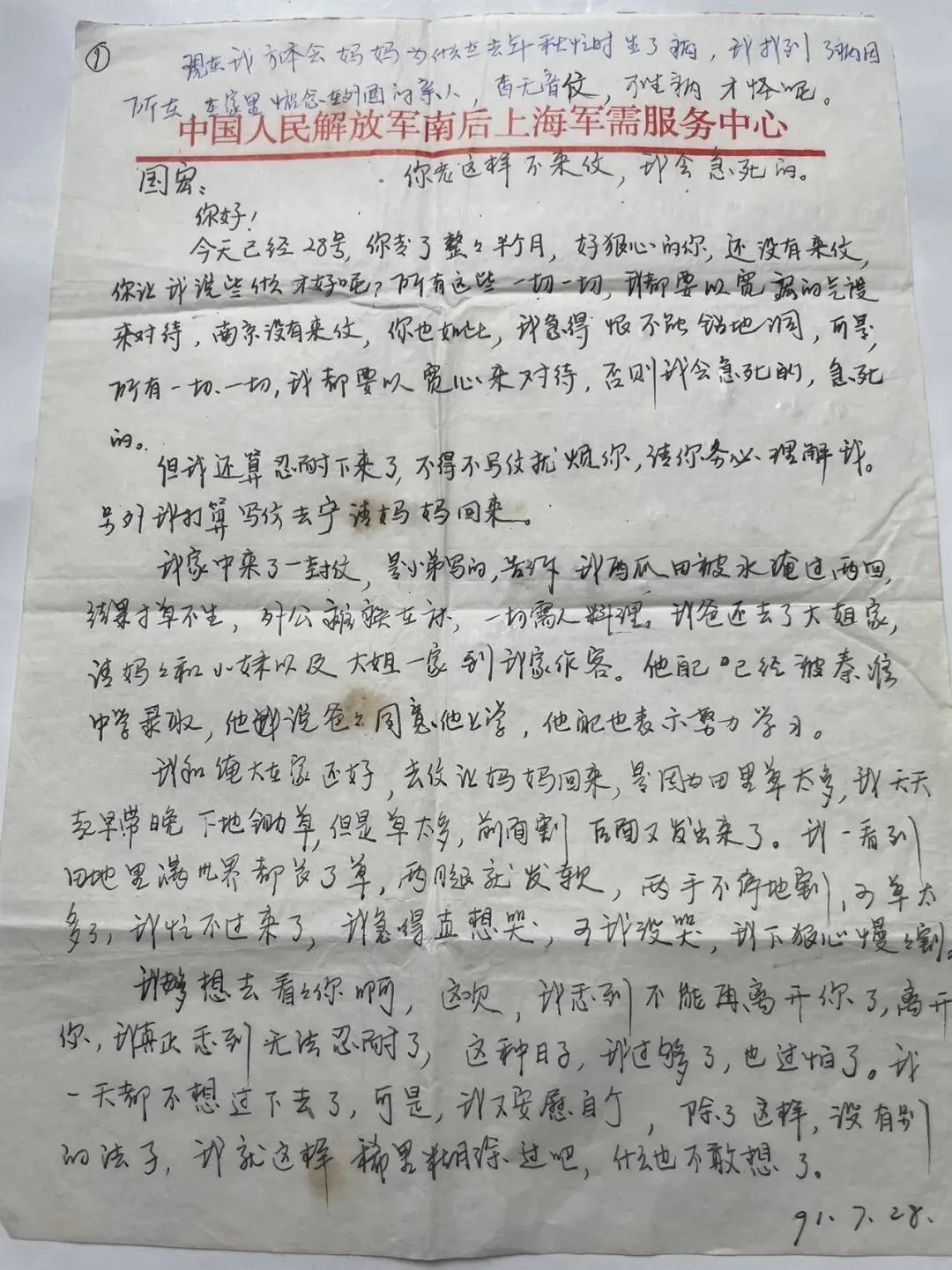 我和俺大(公公)在家还好。去信让妈妈回来,是因为田里杂草太多,我天天起早到带晚下地除草。但是草太多,前面割,后面又发出来了。