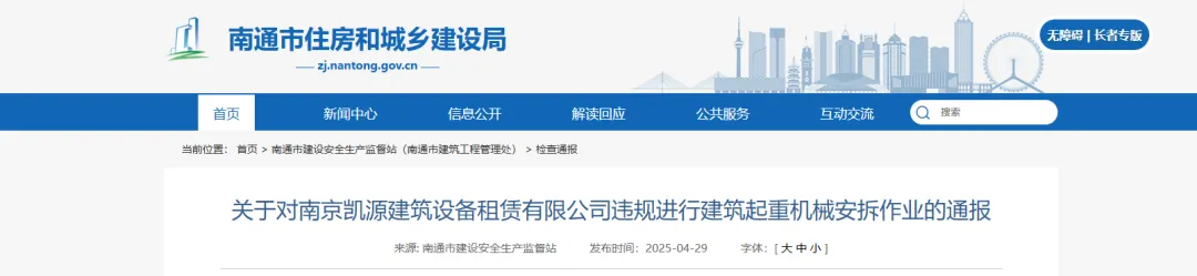 南京凯源公司一个月内多次违规安拆起重机械,且未按照要求整改,为严肃落实《建筑起重机械安全监督管理规定》(建设部令第166号)《房屋市政工程生产安全重大事故隐患判定标准(2024版)》《关于做好智能施工升降机使用管理的通知》(苏建函质安〔2024〕163号)《关于进一步加强建筑起重机械安拆(顶升)、附着等各环节安全管理工作的通知》(苏建质安〔2023〕174号)等文件要求,自通报之日起,30天之内暂停南京凯源建筑设备租赁有限公司在南通市主城区开展建筑起重机械安拆(含顶升、附着)业务。