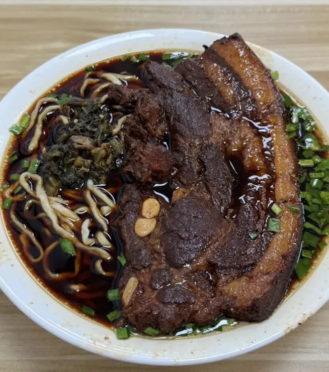 无名老卤面的大肉面,价格是25元一碗,乍一听价格不低,但当你看到那块大大的老卤五花肉几乎把整个碗口都盖住时,你就会觉得这一碗面十分值得。面条类似于镇江锅盖面,小刀面类型,汤底偏黑,但口味相较其他面馆来说不算特别甜。总体来说,这碗面尽管油腻,但绝对是物有所值,吃上一口令人满足。