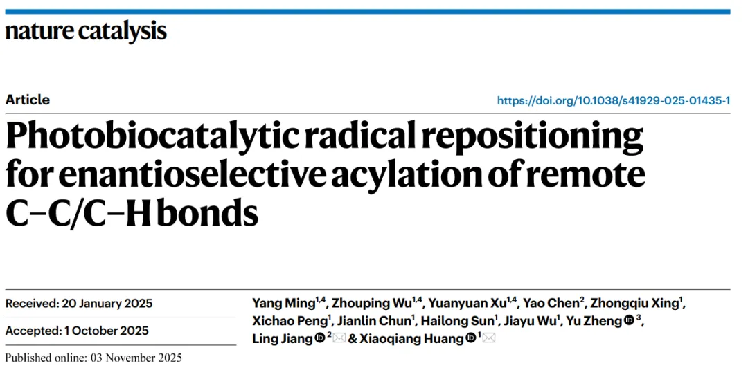 本研究首次将自由基重定位概念引入酶催化体系,实现了远程C–C/C–H键的高对映选择性酰化,突破了传统生物催化在惰性键活化与立体控制方面的局限。该体系在温和、水相、无金属无配体条件下运行,兼具原子经济性与立体精准性,为复杂手性分子的合成提供了新工具。未来可通过酶工程进一步拓展底物范围、提升催化效率,并探索其他类型的自由基迁移模式。该工作彰显了光‑酶协同催化在实现非天然自由基转化中的强大潜力,为绿色合成与生物催化交叉领域的发展提供了新思路。