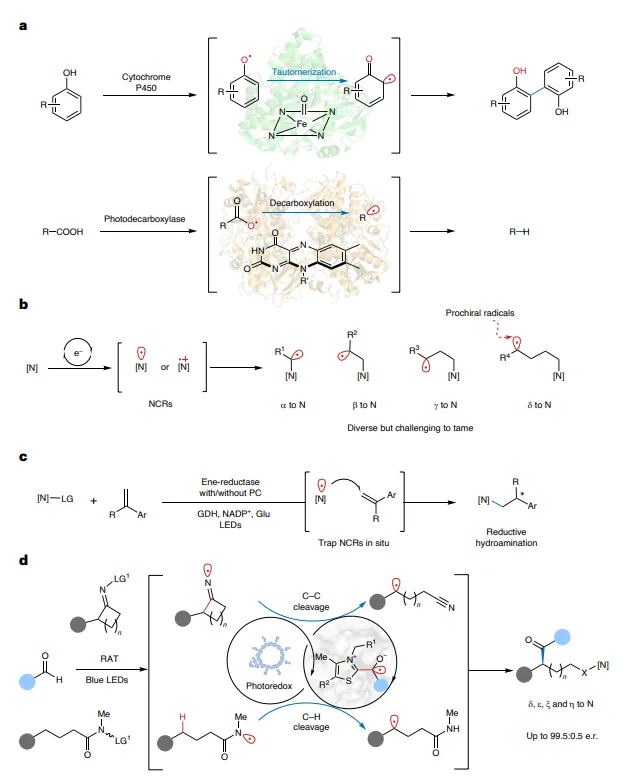 氮中心自由基是一类重要的反应中间体,近年来在可见光催化下可通过1,2-至1,n-迁移实现远程官能团化。然而,如何控制重定位后生成的潜手性碳自由基的立体化学仍是一个巨大挑战。目前仅有少数手性铜催化剂能实现对这类自由基的对映控制,而生物催化体系在此领域的应用几乎空白。近年来,光生物催化快速发展,氮中心自由基与酶的兼容性已得到初步验证,但其反应模式多局限于自由基直接捕获,尚未涉及惰性键的激活与远程迁移。